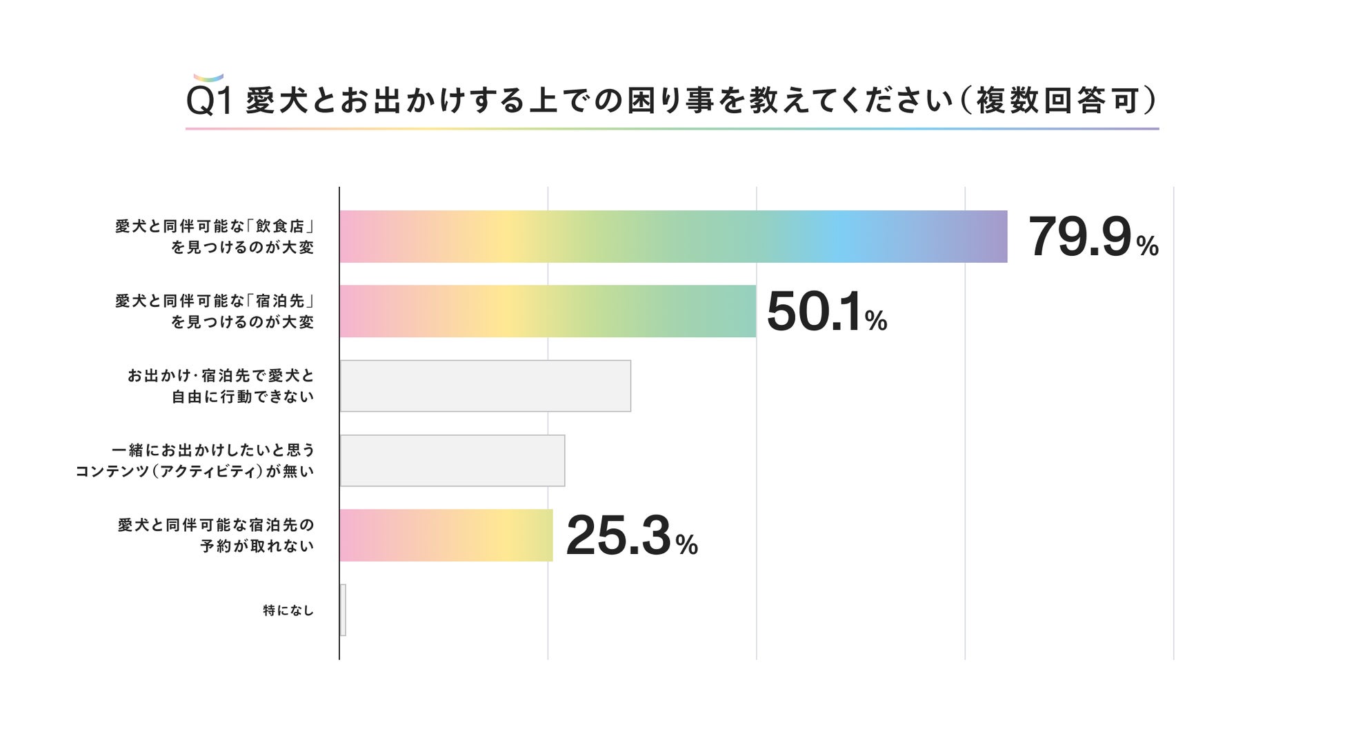 「愛犬とお出かけする上での困り事を教えてください」の問いに対して、79.9%が「愛犬と同伴可能な飲食店を見つけるのが大変」、50.1%が「愛犬と同伴可能な宿泊先を見つけるのが大変」、25.3% が「愛犬と同伴可能な宿泊先の予約が取れない」と回答しており、お出かけ先自体を見つけることが難しい上、「車を持っていないため移動手段がない」との回答もあり、移動方法も含めてハードルが高いことが伺えます。