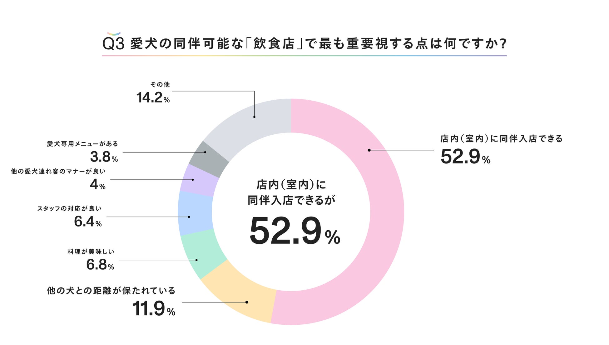 「愛犬の同伴が可能な宿泊施設で最も重要視する点は何ですか?」の問いに対して、トップは「ご飯を愛犬と同じ空間で食べられる(27.9%)」で、次いで「一緒に過ごせるエリアが広い(19.9%)」、「ご飯を愛犬と一緒に部屋で食べれる(部屋食がある・12.8%)」と回答しています。また、その他のフリー入力で「愛犬と一緒にベッドで寝れる」というニーズも複数出てきていました。飲食店で最重要視する点についても、過半数の52.9%が「店内(室内)に同伴入店できる」と回答し、ずっと一緒に過ごせる空間がある宿泊施設や飲食店を求めていることがわかります。