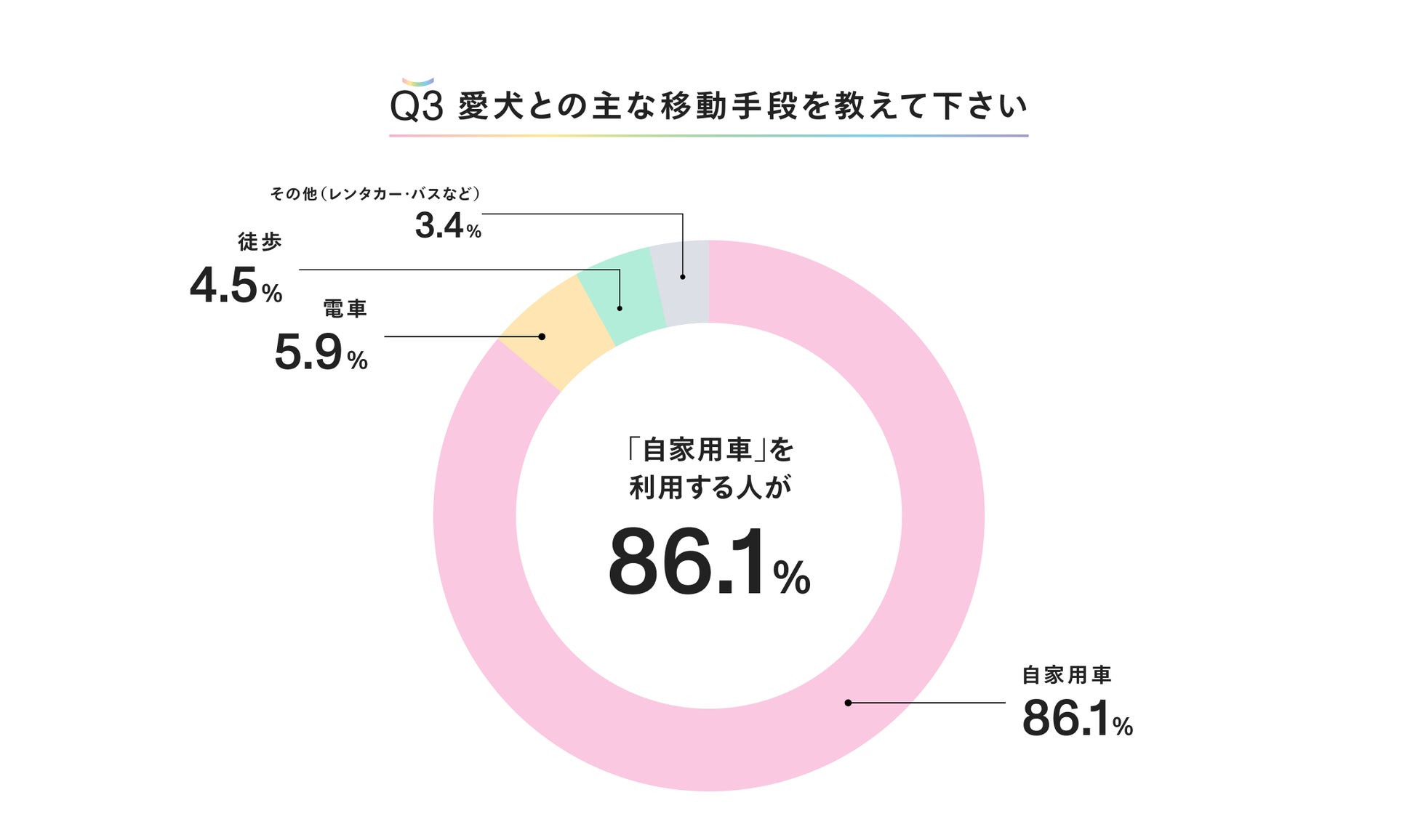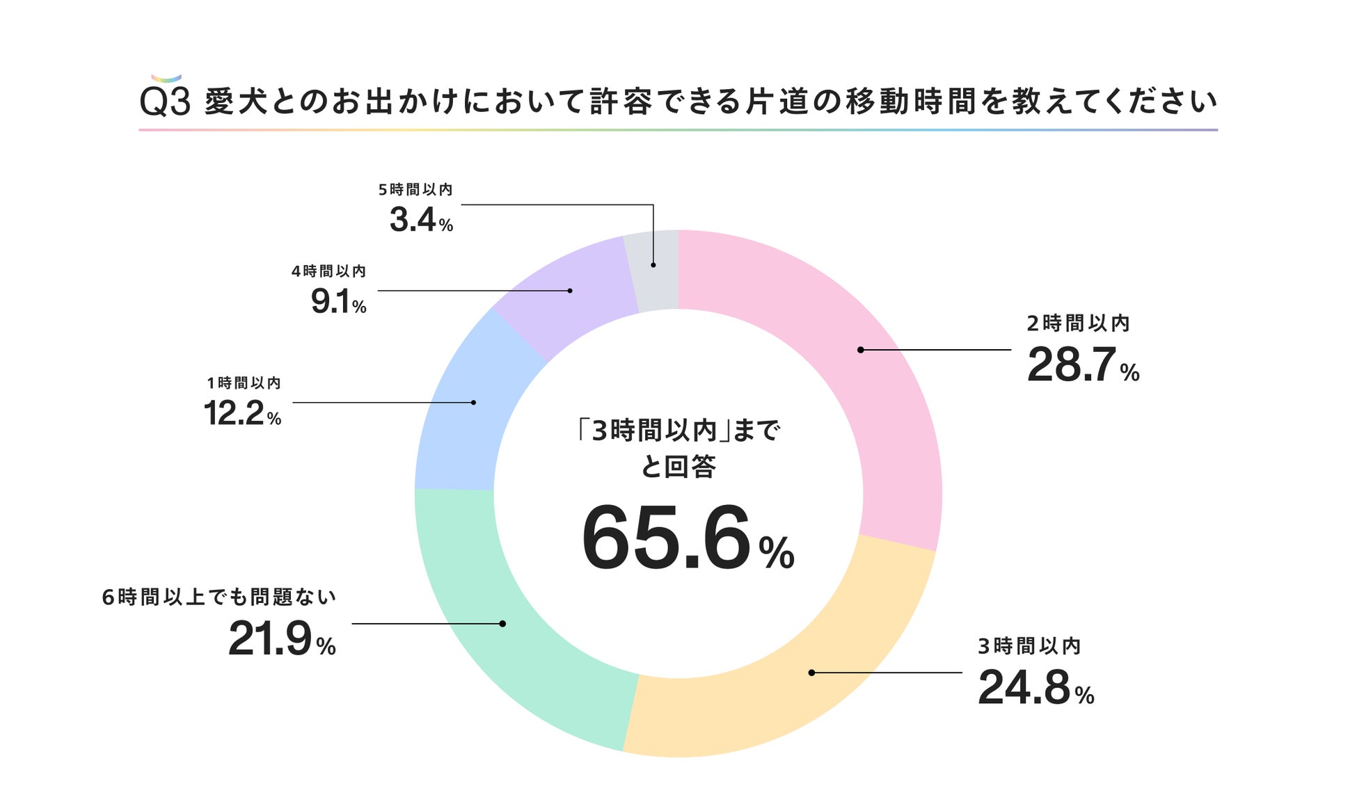 「愛犬との主な移動手段を教えてください」の問いに対しては、圧倒的に「自家用車(86.1%)」で移動している人が多いことがわかりました。許容できる移動時間は、片道「2時間以内(28.7%)「3時間以内(24.8%)」「1時間以内(12.2%)となり、公共交通機関の利用は制限や愛犬のコンディションを考慮すると難しい上、他の方への配慮が伺える結果になりました。
