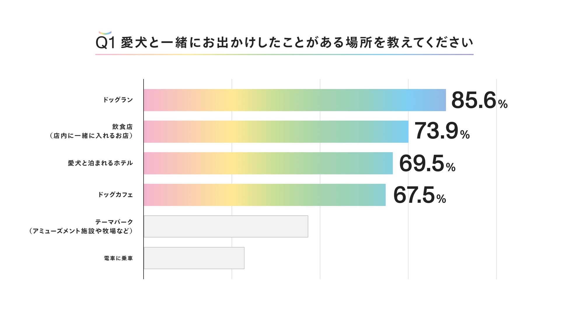 「愛犬と一緒にお出かけしたことがある場所を教えてください」との問いに対して、85.6%が「ドッグラン」、次いで「飲食店(店内に一緒に入れるお店・73.9%)」「愛犬と泊まれるホテル(69.5%)」と回答。一方で「愛犬と一緒に行ってみたい場所を教えてください」の問いには、56.5%が「愛犬と泊まれるホテル」次いで「飲食店(店内に一緒に入れるお店・45.7%)」「テーマパーク(アミューズメント施設・牧場など・45.3%)」という結果になり、ドッグランは身近な存在になっており、「愛犬と泊まれるホテル」や「テーマパーク」など、特別な時間を過ごしたいというニーズが高いことが伺えます。