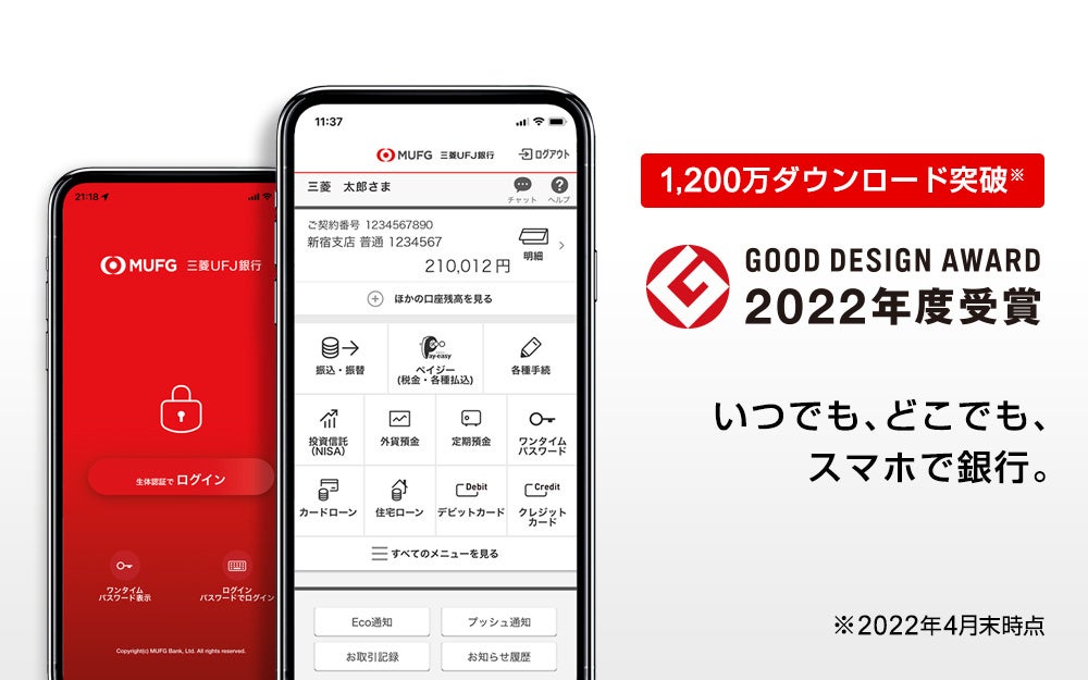 今般、その取り組みが評価され、三菱UFJ銀行が提供するインターネットバンキング「三菱UFJダイレクト」およびお金の自動管理アプリ「Mable」、三菱UFJ信託銀行が提供する確定拠出年金加入者向けアプリ「D-Canvas」の3つのサービスが、「2022年度グッドデザイン賞」(主催:公益財団法人日本デザイン振興会)を受賞しました。