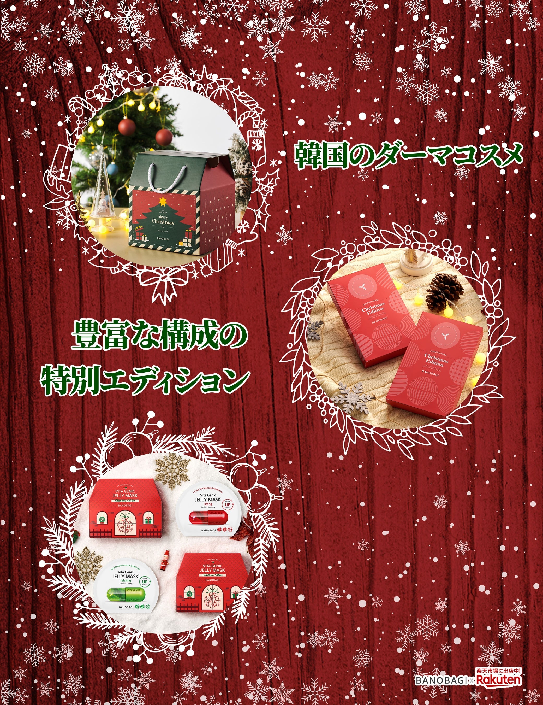 その他にも、ぽかぽかと温かなクリスマスの雰囲気がただようホリデーシーズン限定数量のフェイスマスクエディションをお値引き価格でお試しいただけます。タイのエッセンスマスクパック、部門一位に輝いたゼリー状マスクで構成された「2022インゼクションマスク・クリスマスエディション」をそれぞれ20%割引された価格でお求めいただけ、ご購入時にはバノバギのオリジナルミラーをプレゼントいたします。