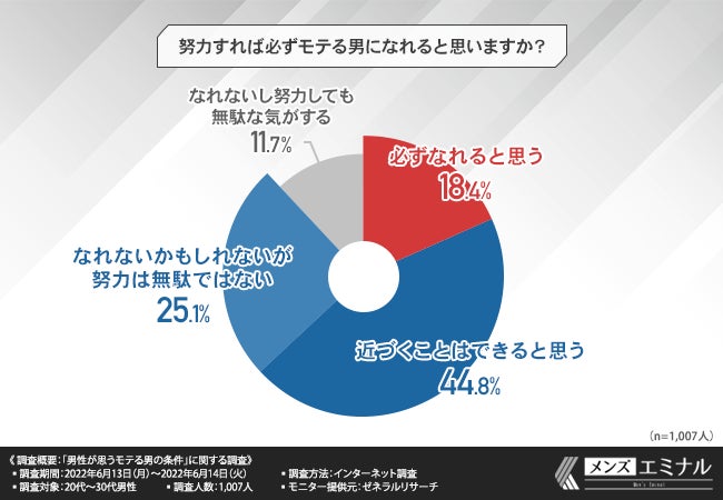 そこで、「努力すれば必ずモテる男になれると思いますか?」と質問したところ、6割以上の方が『必ずなれると思う(18.4%)』『近づくことはできると思う(44.8%)』と回答しました。