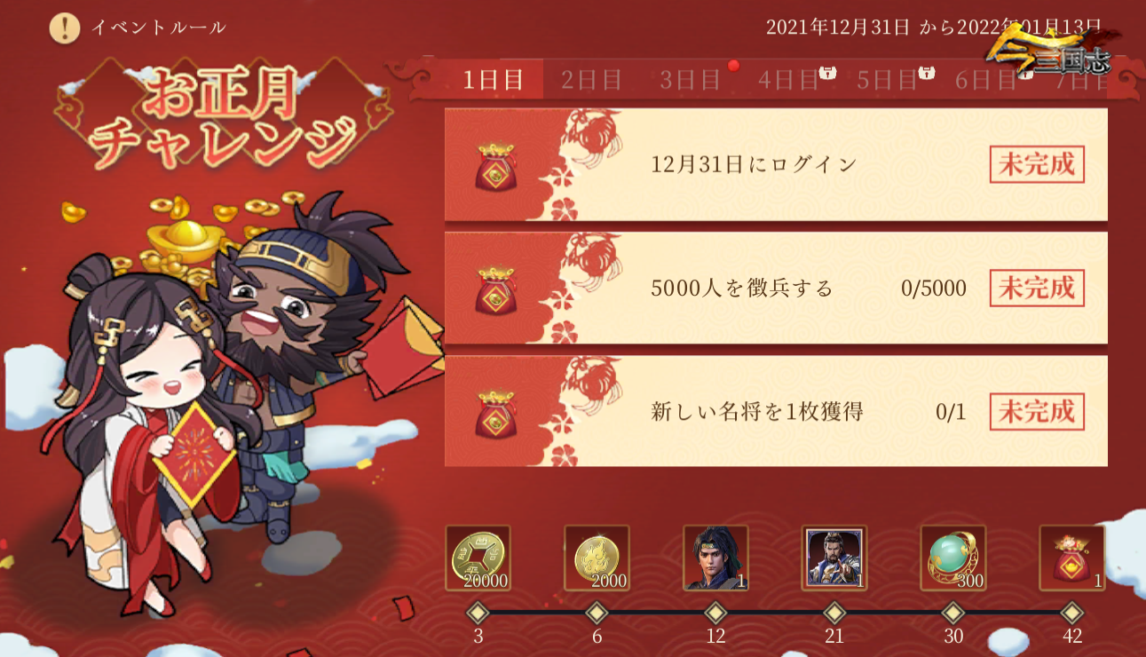 合計三つのキャンペーンとイベントが登場し、その中にはプレイヤーへの新年お祝いとして、連続ログインボーナスの開催と、お得な新春セットの販売が2021年12月31日(金)より開始しました。それだけではなく、興味性を堪能できるお正月チャレンジもありますので、ぜひ『今三国志』で三国武将たちと新春を満喫しましょう!