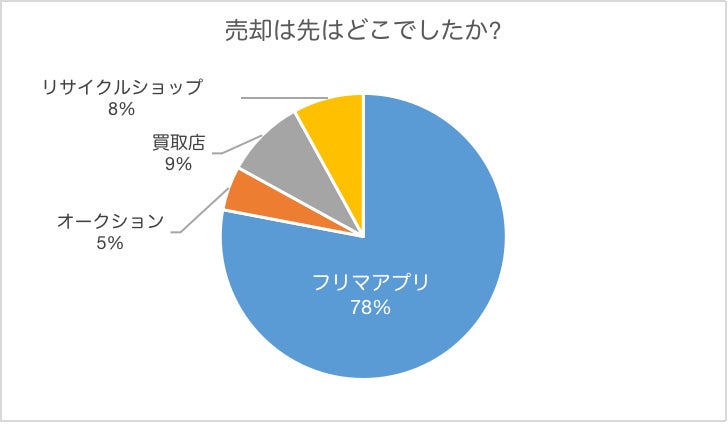 売却先の調査では、「フリマアプリ」と「オークション」が約8割を占め、「買取店」や「リサイクルショップ 」などの業者は約2割でした。