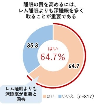 一方、同じ調査の中で、「睡眠の質を高めるためにはレム睡眠よりも深睡眠を多くとることが重要である」と64.7%と回答していることからも、半数以上の人が「レム睡眠よりも、深睡眠のほうが大事だと考えている」ということがわかりました。