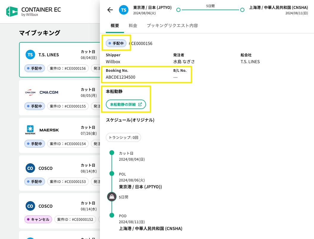 また、その他のアップデートとして、ブッキングステータスの表示やBooking No.とB/L No.の確認が可能になりました。