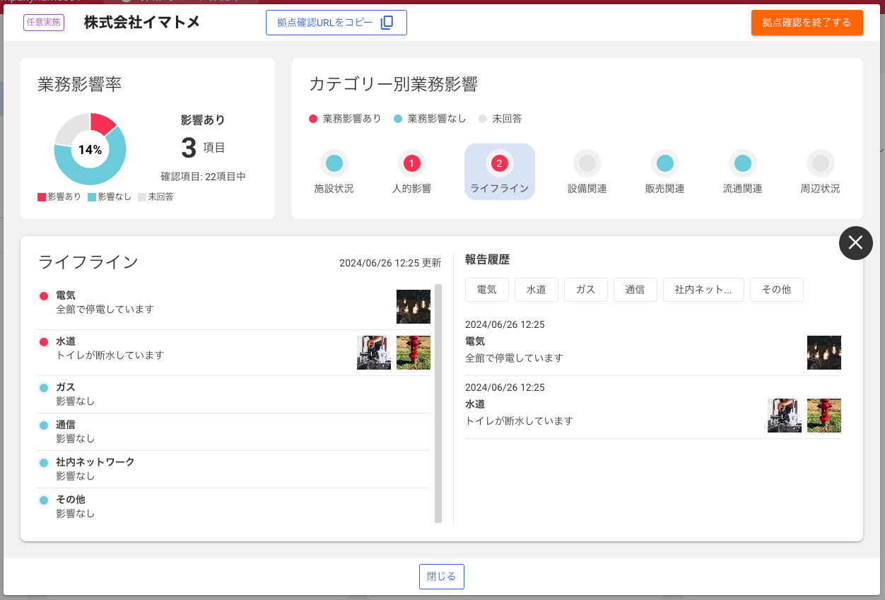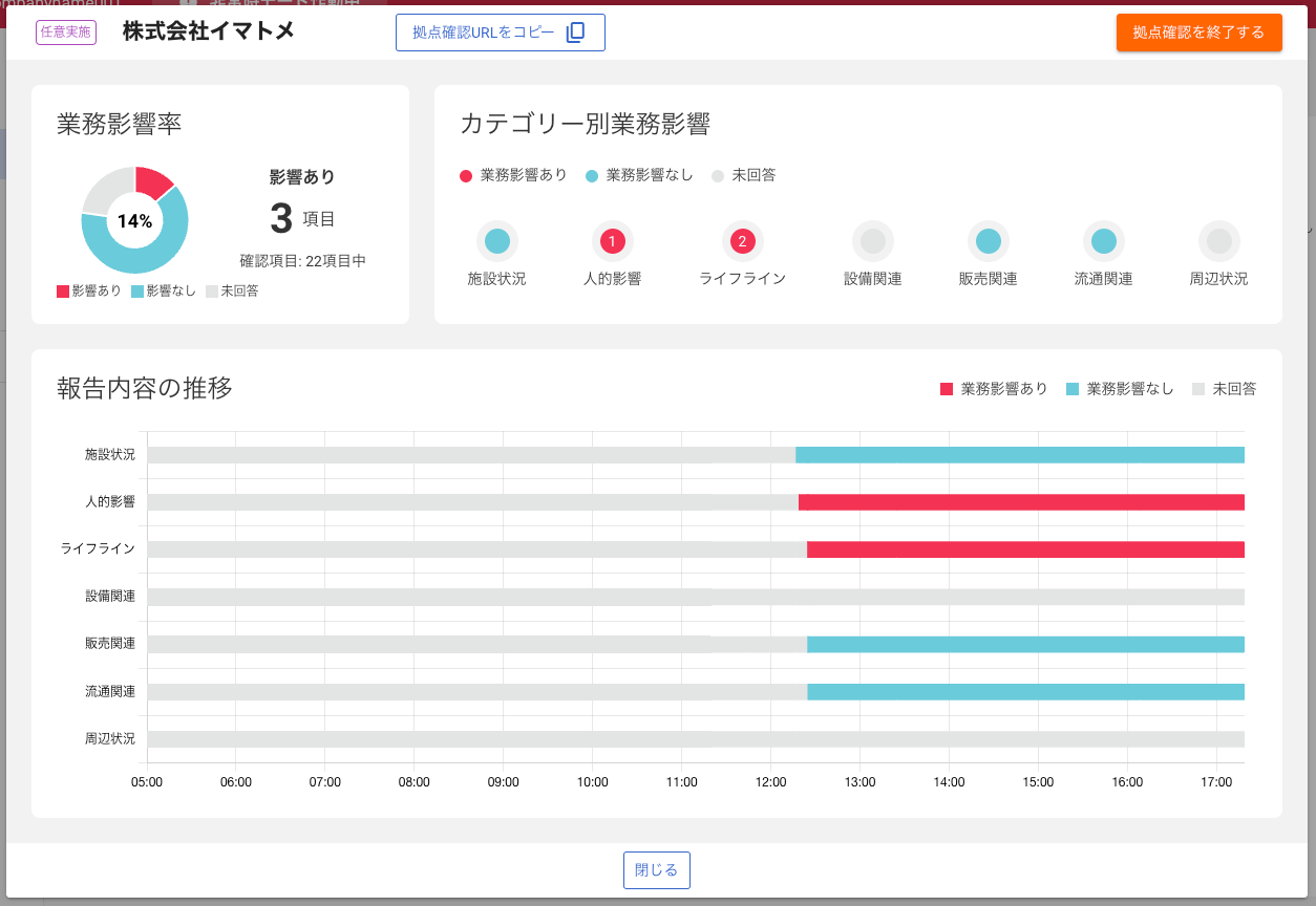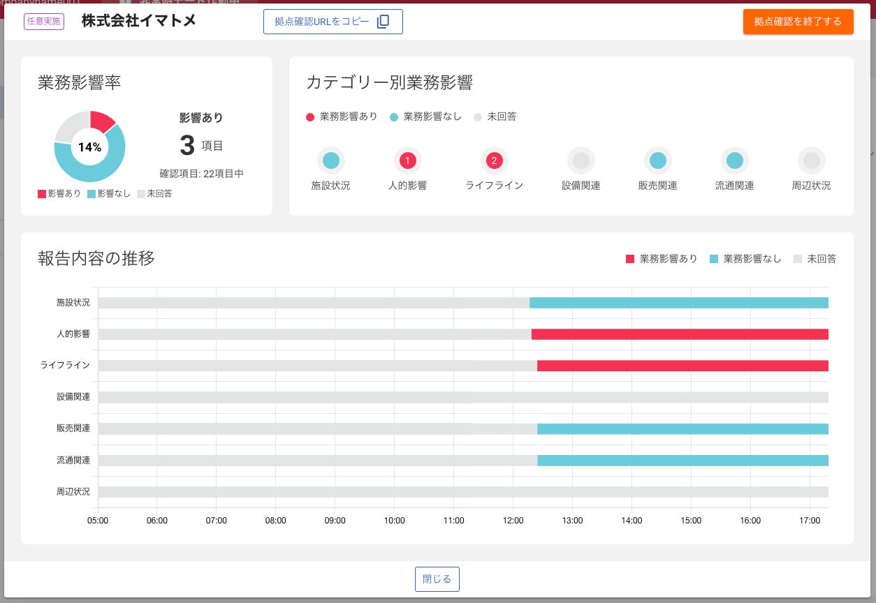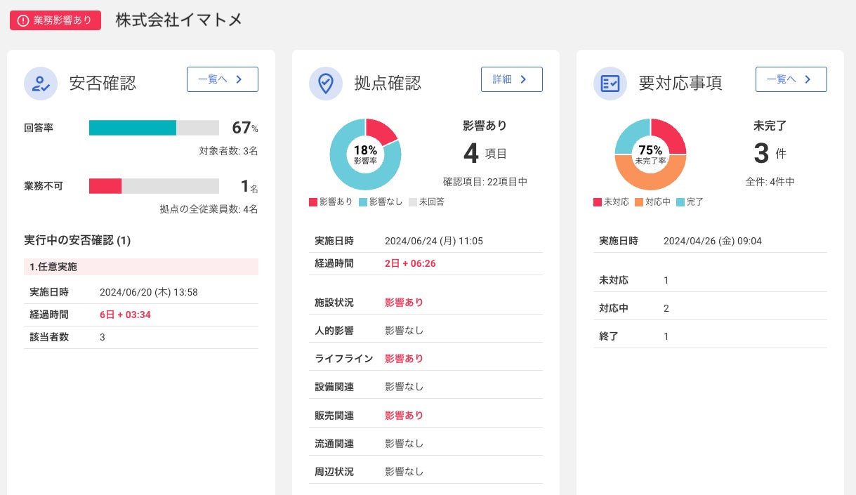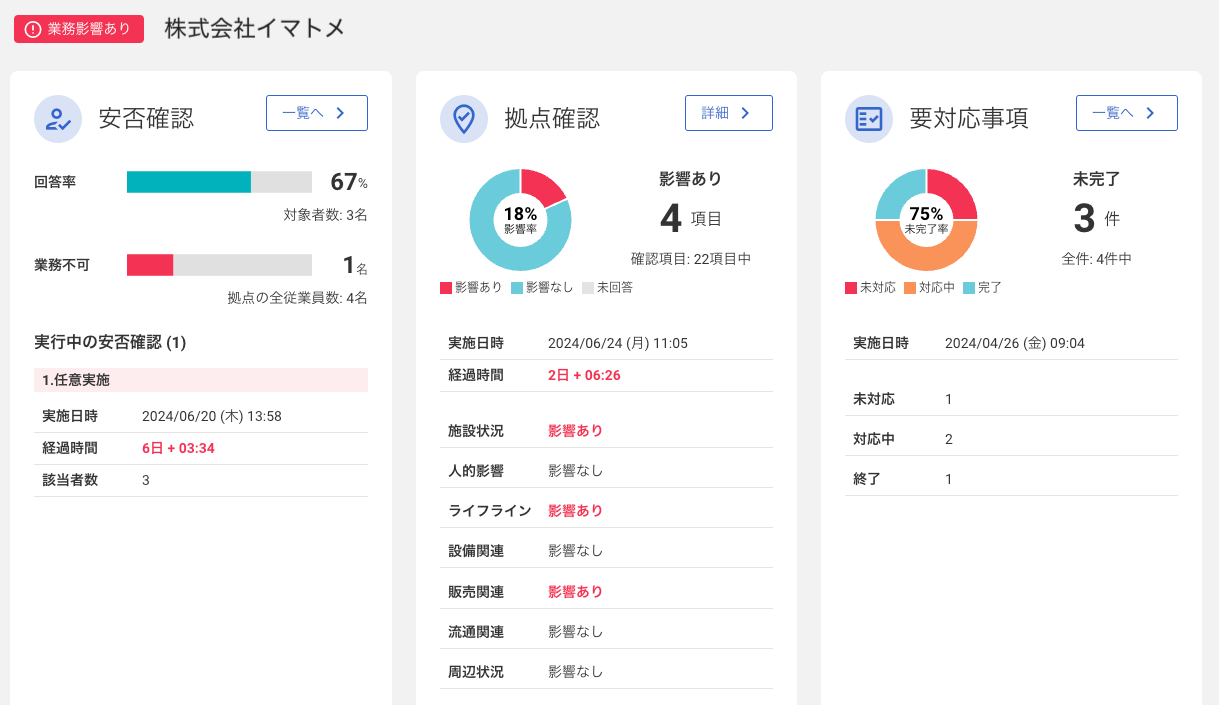 以上の拠点確認機能の大幅なアップデートにより、拠点の状況確認がより詳細に把握できるようになるだけではなく、全社としての影響度も常に把握できる、より高いレベルでのBCP対応のオートメーション化の実現を果たしました。