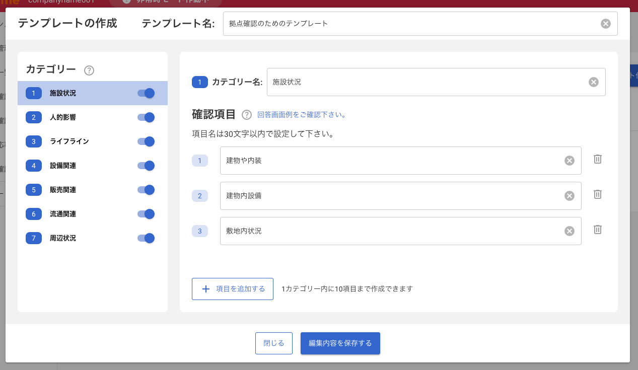 拠点確認テンプレート機能のリリースにより、危機対応時に拠点に対して確認したい項目を自由に作成、編集することができるようになりました。複数のテンプレートを作成して、拠点ごとに確認項目を設定することも可能です。