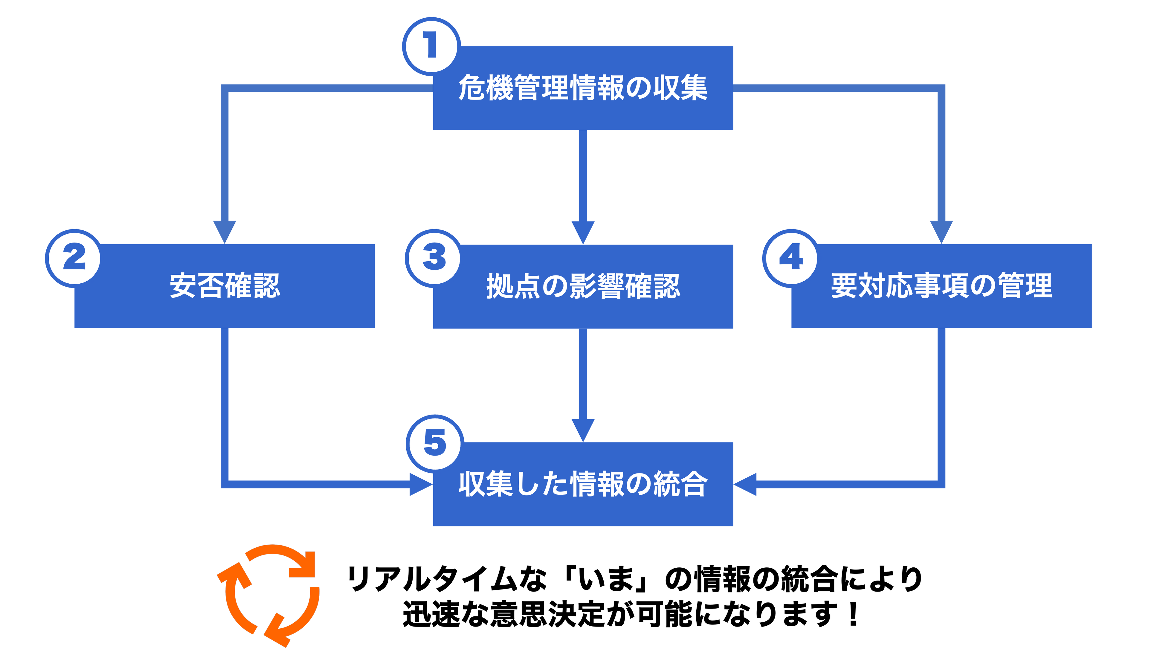imatomeは、以下の5つの機能の連携により、災害時に従業員や拠点の状況などBCP対応を行う上で必要な情報を一つにまとめて確認できるオールインワン危機管理サービスです。自社への影響や取り組むべき事項を効率的に洗い出し、迅速な意思決定を可能にするimatomeをご利用いただくことにより、事業継続に必要な一連の対応の早期収束に貢献します。