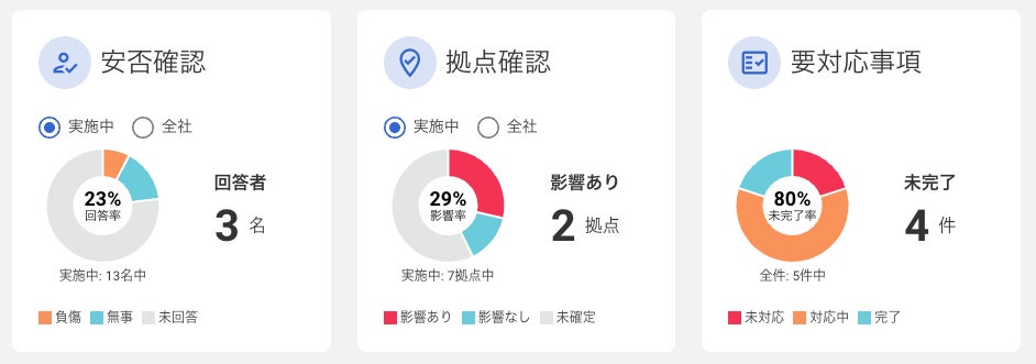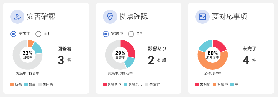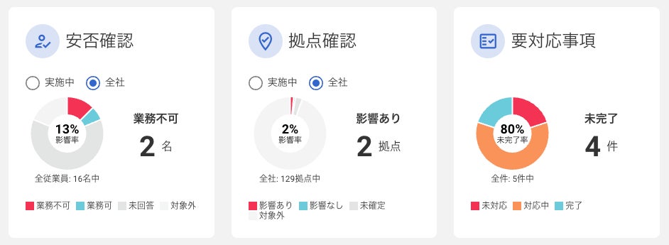 これにより、安否の回答状況だけではなく、全社における人的リソースへの影響度を常に把握できるようになります。