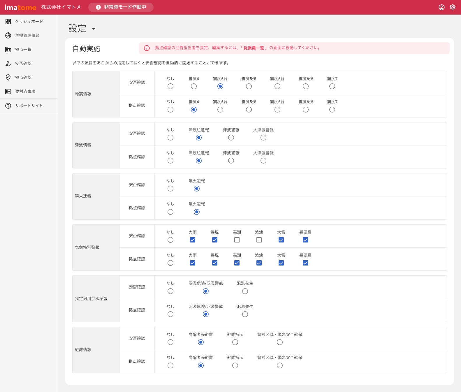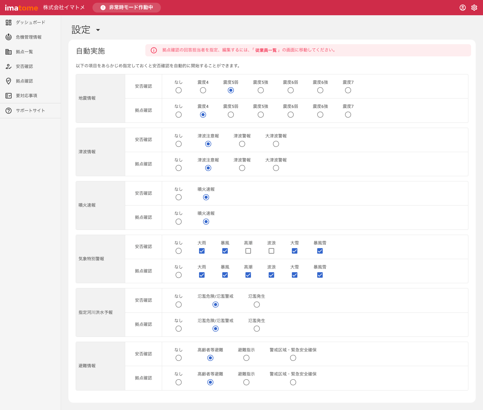 安否確認自動実施機能も同様に上記6つの災害カテゴリーに対応していますが、災害カテゴリーごとのしきい値は拠点確認・安否確認で各々分けて設定することができます。