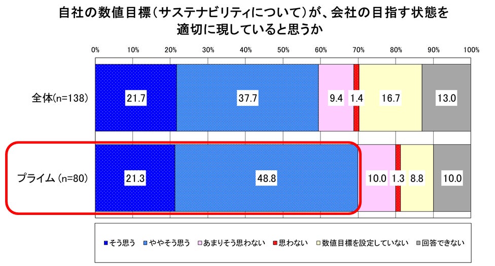 「自社のサステナビリティに関する数値目標が、会社の目指す姿を適切に現わしていると思うか」という設問に対する肯定割合(そう思う、ややそう思う)は、特にプライム市場に上場している企業で高くなっている(7割が肯定)。したがって、目指す姿を適切な目標として設定し、その実現度合いについても公表をしていくことが普通レベルの活動となってきていると推察される。