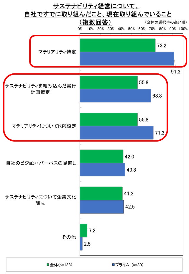 また、「サステナビリティを組み込んだ実行計画の策定」、「マテリアリティについてのKPI設定」に関しても、プライム市場に上場している企業では7割前後の企業が取り組み済み(取り組み中を含む)であることが明らかになった。