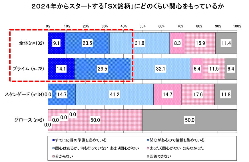 特にプライム市場の企業において、SX銘柄に関心を持って行動を起こしている割合は4割程度に留まっている。関心がなかったり、知らない企業がプライム市場でも2割近くあり、今後の動きが注目される。