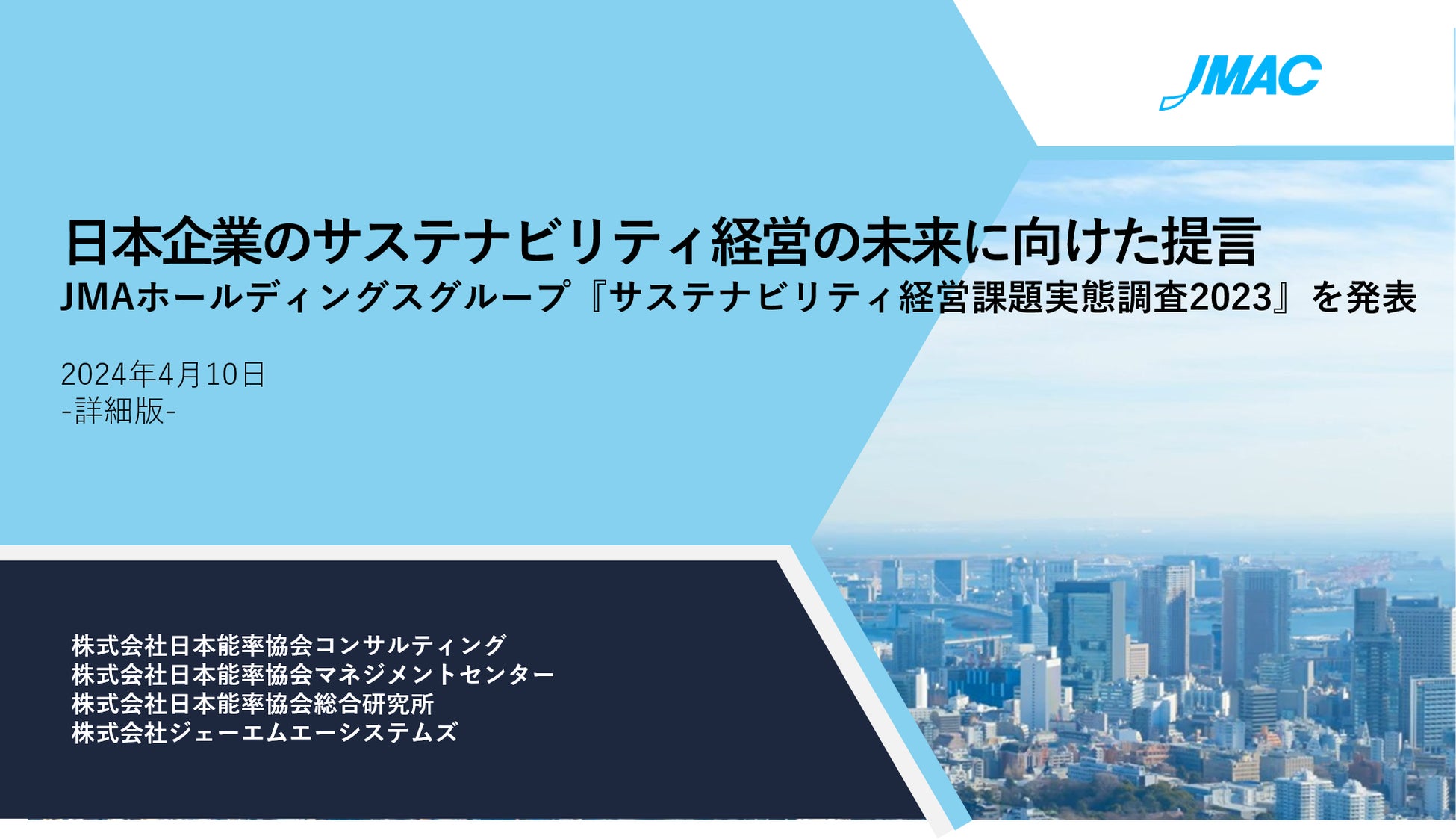 株式会社日本能率協会コンサルティング(本社:東京都港区・代表取締役社長:小澤勇夫、以下JMAC)、株式会社日本能率協会マネジメントセンター(本社:東京都中央区・代表取締役社長:張士洛、以下JMAM)、株式会社日本能率協会総合研究所(本社:東京都港区・代表取締役社長:譲原 正昭、以下JMAR)、株式会社ジェーエムエーシステムズ(本社:東京都港区・代表取締役社長:坂倉 猛、以下JMAS)は、近年の企業経営と社会のキーワードでもある『サステナビリティ経営』の実像を探るため、4社合同で『サステナビリティ経営課題実態調査』を実施いたしました。本調査は2022年度実施に続いて第2回目の調査となり、このほど本調査の最終調査がまとまりました。