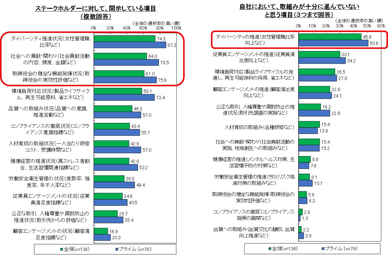 特にプライム市場の企業は、「ダイバーシティ」「社会貢献活動」「取締役会の状況」は8割前後で開示が進んでいる一方、ダイバーシティ推進の取組みは十分でないと認識されている。