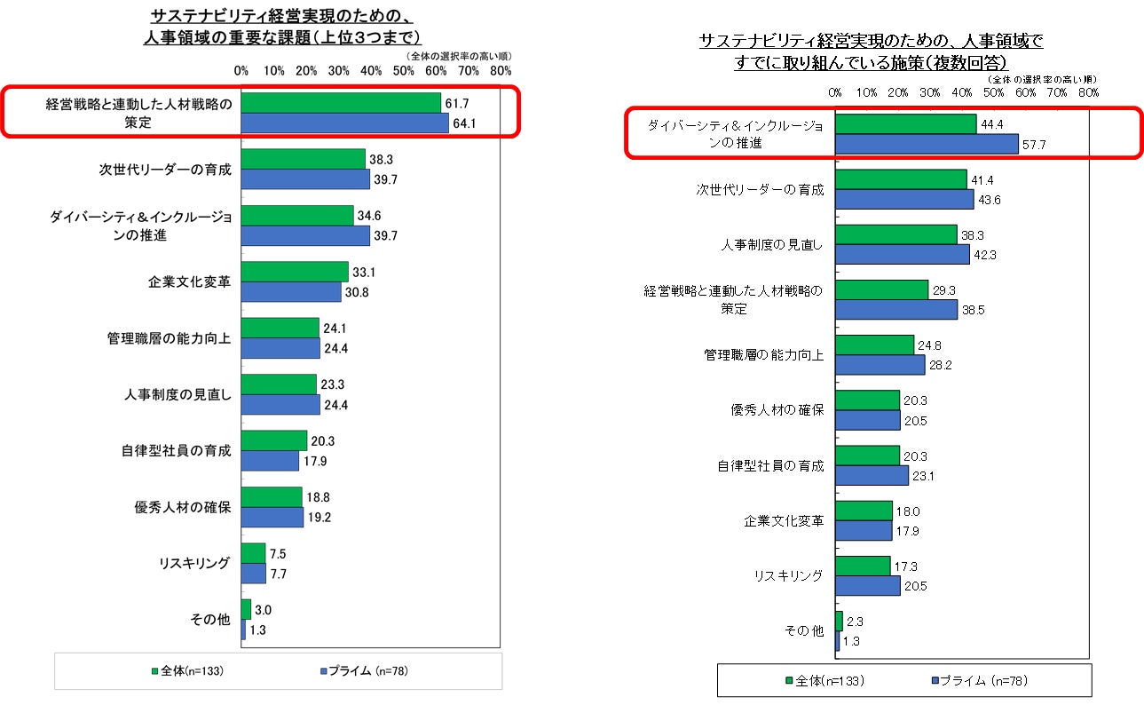 今回の調査では、第1回の調査では聞いていなかった、人的資本経営領域での取り組みや、具体的に取り組んでいるサステナビリティ関連事業の内容についても調査を行った。その結果、「経営戦略と連動した人事戦略の策定」が最も重要な人事領域の課題と認識されていた。また、「ダイバーシティ&インクルージョンの推進」は、取り組みが十分でないと認識されながらも、プライム市場の企業では、既に取り組んでいる企業が6割近くとなっている。