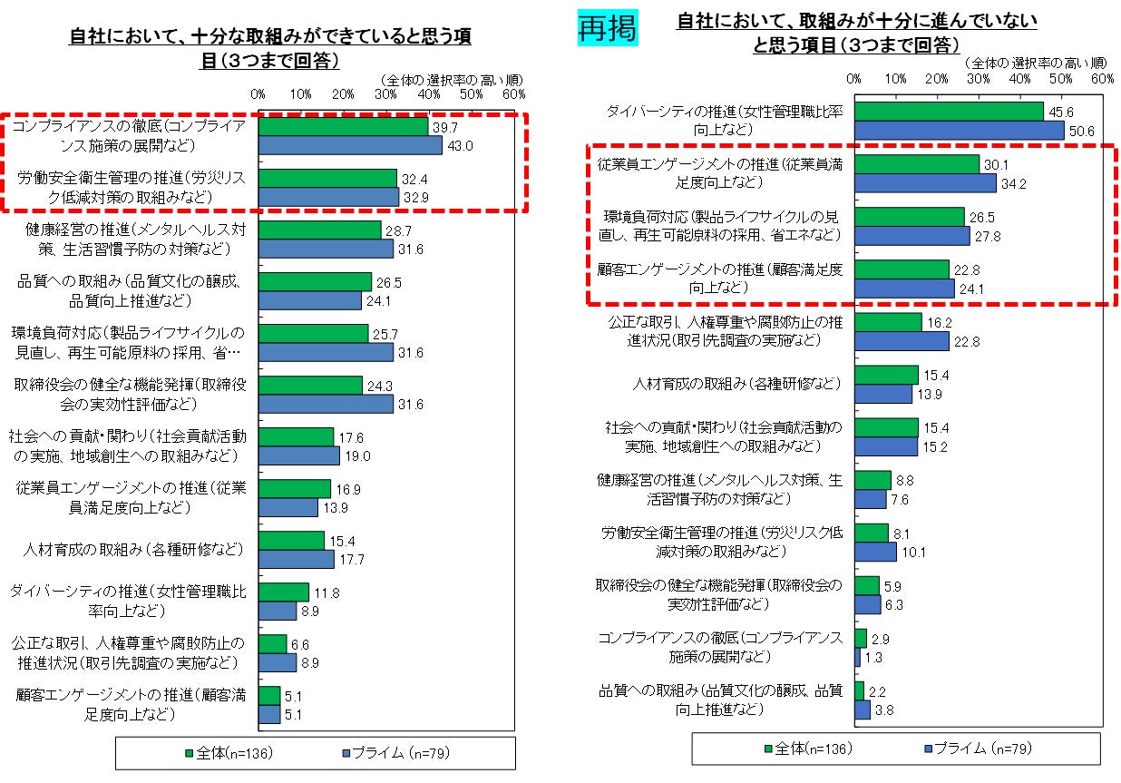 「コンプライアンス」「労働安全衛生管理」など、守りの取り組みは進みつつあるも、プライム市場の企業においても、3~4割程度しか十分できていると感じていない様子が伺える。一方、「ダイバーシティ」は最も課題と感じている企業が多く、「従業員エンゲージメント」「環境負荷対応」「顧客エンゲージメント」においても改善の余地があると認識されている。