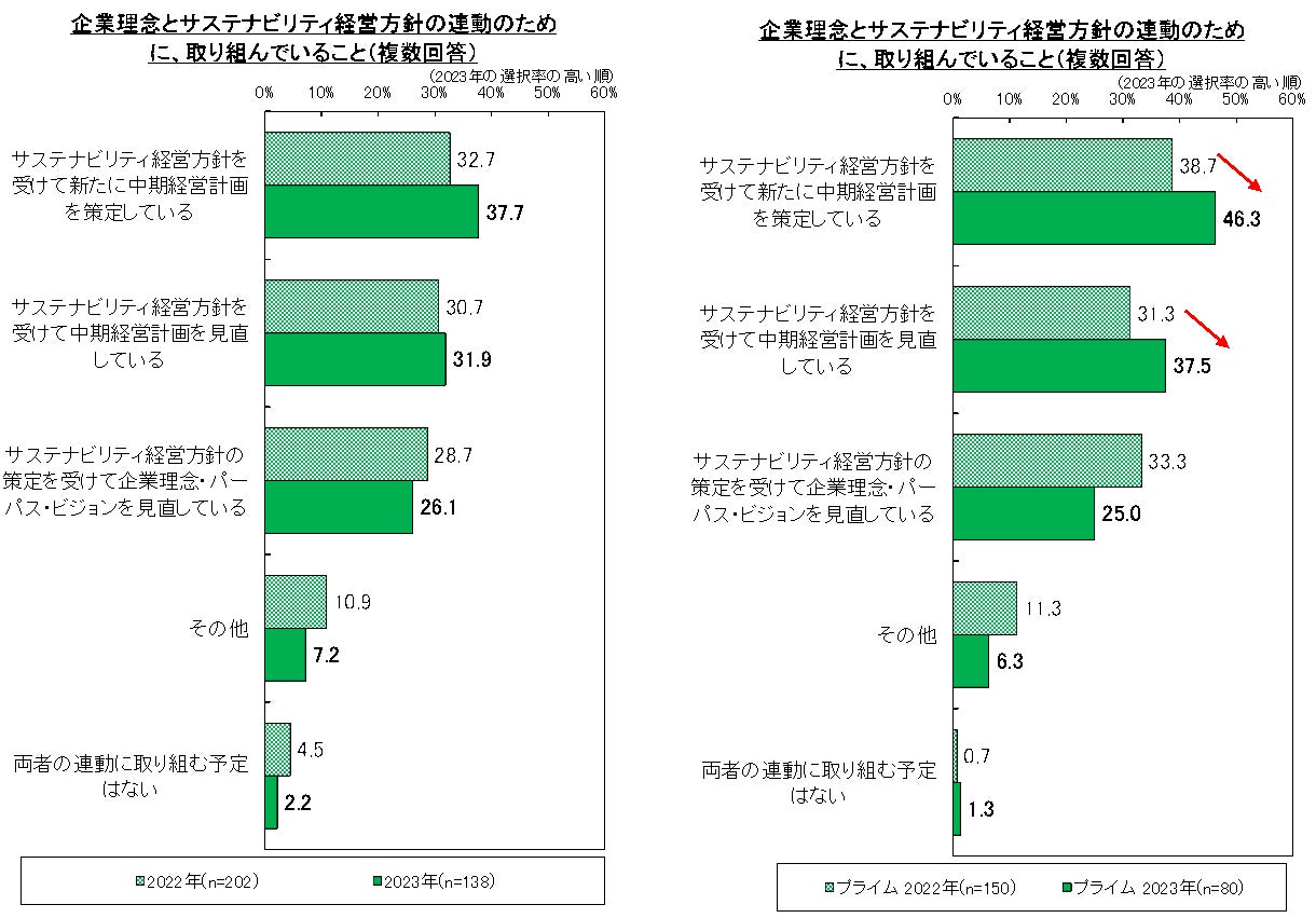 特にプライム市場の企業を経年で比較すると、サステナビリティ経営方針を受けて新たに中期経営計画を策定したり、中期経営計画を見直す企業の割合がやや増えている。サステナビリティ経営方針が具体的な計画に落とし込まれてきている傾向が見て取れる。