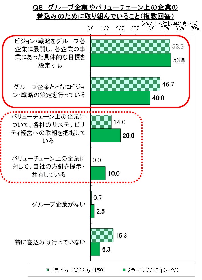 グループ企業と一緒に取り組むこと(ビジョン・戦略の策定・展開や具体的な目標設定)は、プライム市場に上場している企業の4~5割で実施されているが、外部企業の巻き込みについては、まだまだ道半ばである。