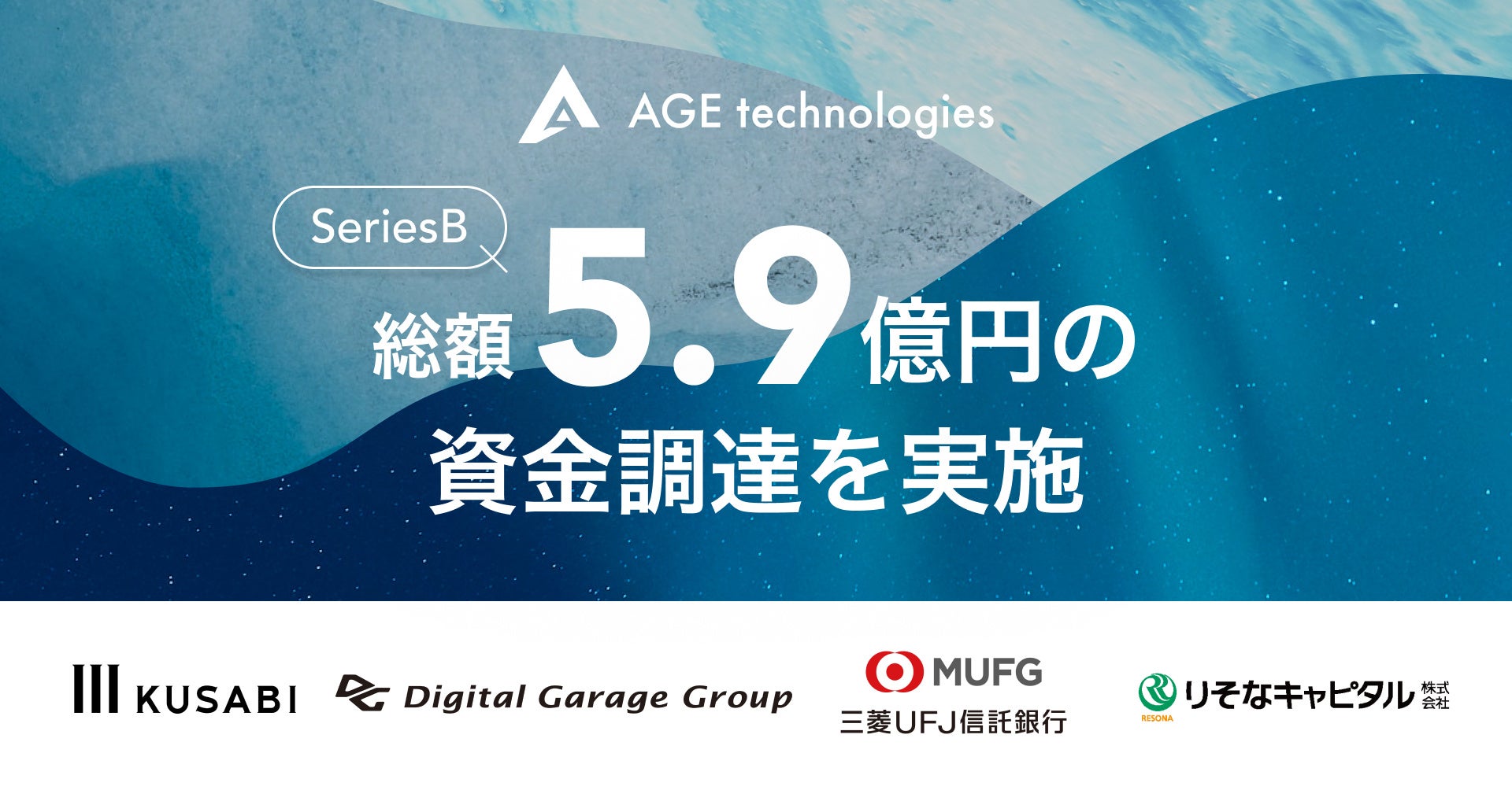 2023.4.12 株式会社AGE technologies(本社:東京都豊島区、代表取締役CEO:塩原優太、以下「AGE technologies」)は、シリーズBラウンドで総額5.9億円の資金調達を実施しました。本シリーズBラウンドは、KUSABI、DGベンチャーズ、Open Network Lab・ESG1号投資事業有限責任組合(通称:Earthshotファンド)、三菱UFJ信託銀行、りそなキャピタル6号投資事業組合を引受先とする第三者割当増資と日本政策金融公庫とりそな銀行からの融資によるものです。