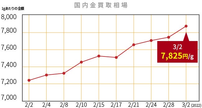■2022年3月2日(水) 金買取の国内公表価格が7,825円/gに到達。