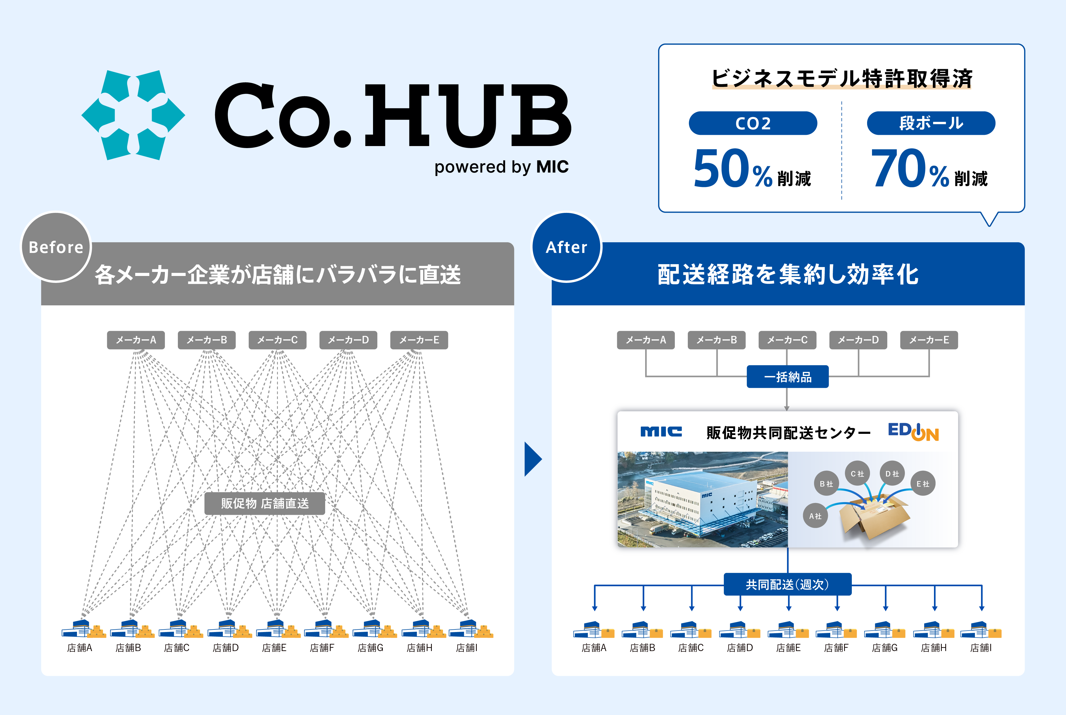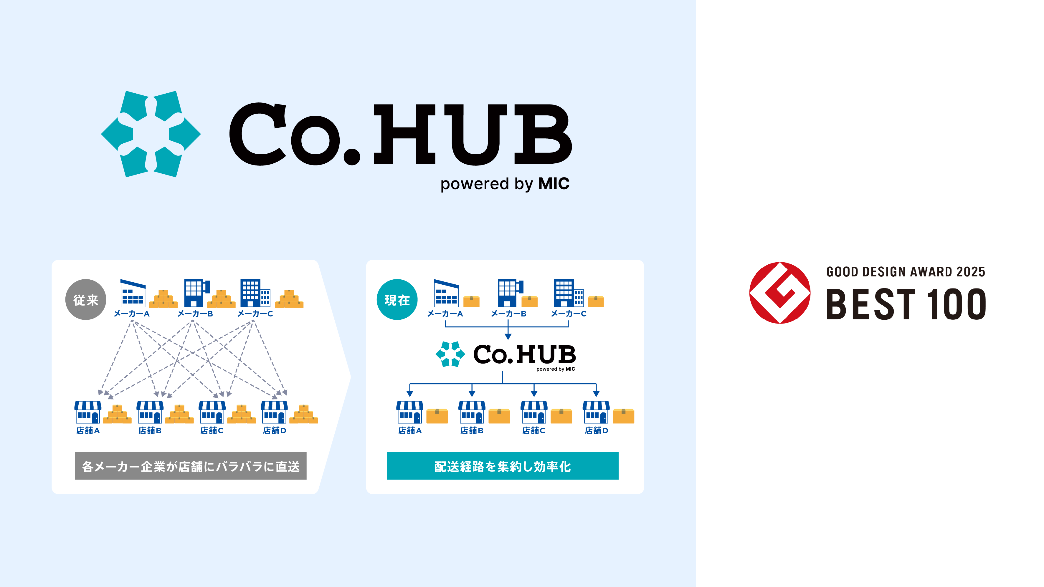 この度、2025年度グッドデザイン・ベスト100(主催:公益財団法人日本デザイン振興会)を受賞した販促物共同配送プラットフォーム「Co. HUB」が、新たに家電量販店大手である株式会社エディオン(本社:大阪府大阪市、代表者:代表取締役会長執行役員 CEO 久保 允誉、以下「エディオン」)において、2026年4月より導入されることが決定しましたので、お知らせいたします。「Co. HUB」は、これまで主にドラッグストア業界を中心に導入が進み、店舗現場の負担軽減、物流効率化および環境負荷低減を同時に実現してまいりました。