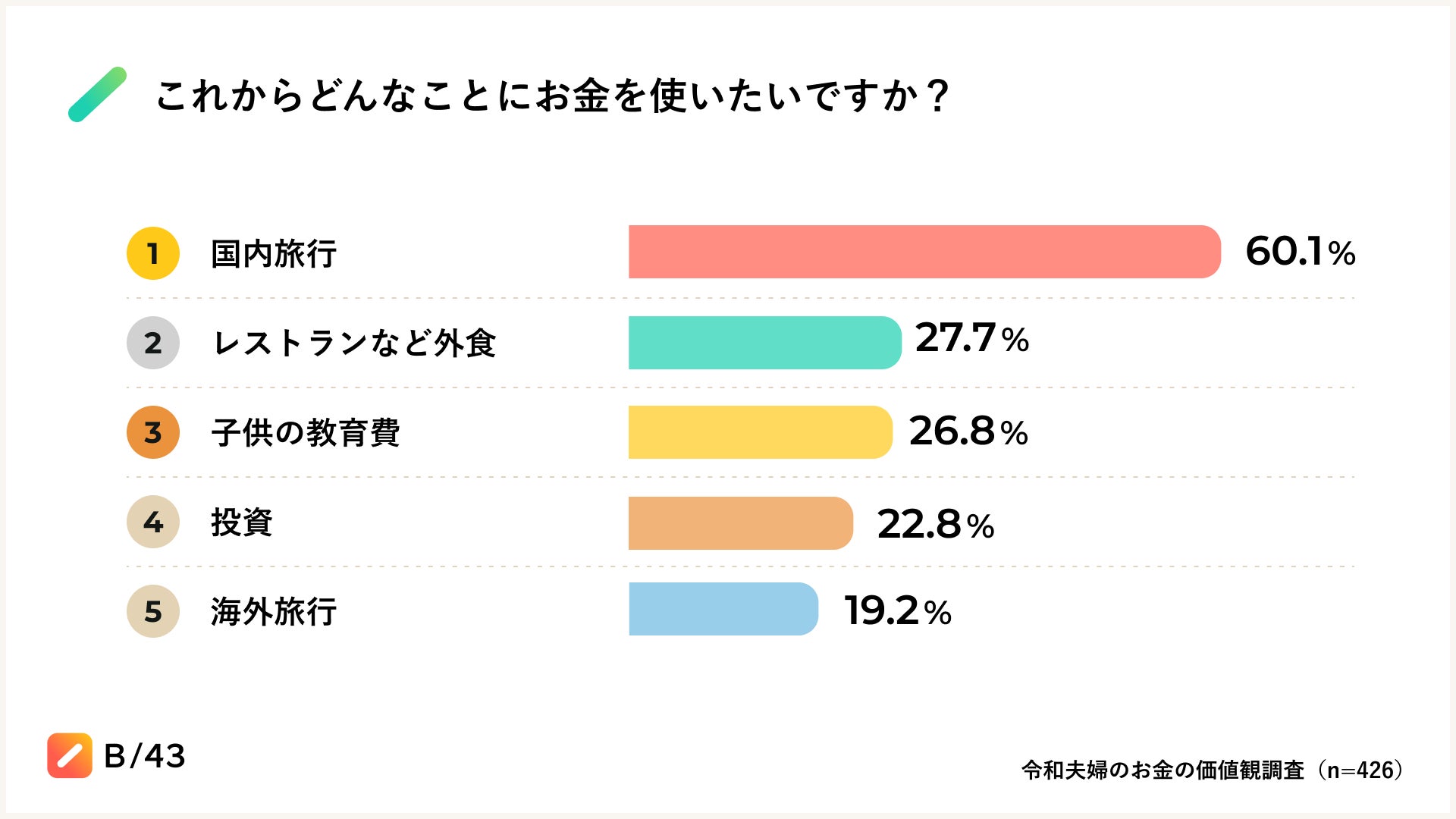 最後に、コロナが5類に移行する中で、これからどんなことにお金を使いたいかを尋ねたところ、「国内旅行」(60.1%)がトップとなりました。次いで、「レストランや居酒屋などの外食」(27.7%)、「子供の教育費」(26.8%)といった声もあがりました。
