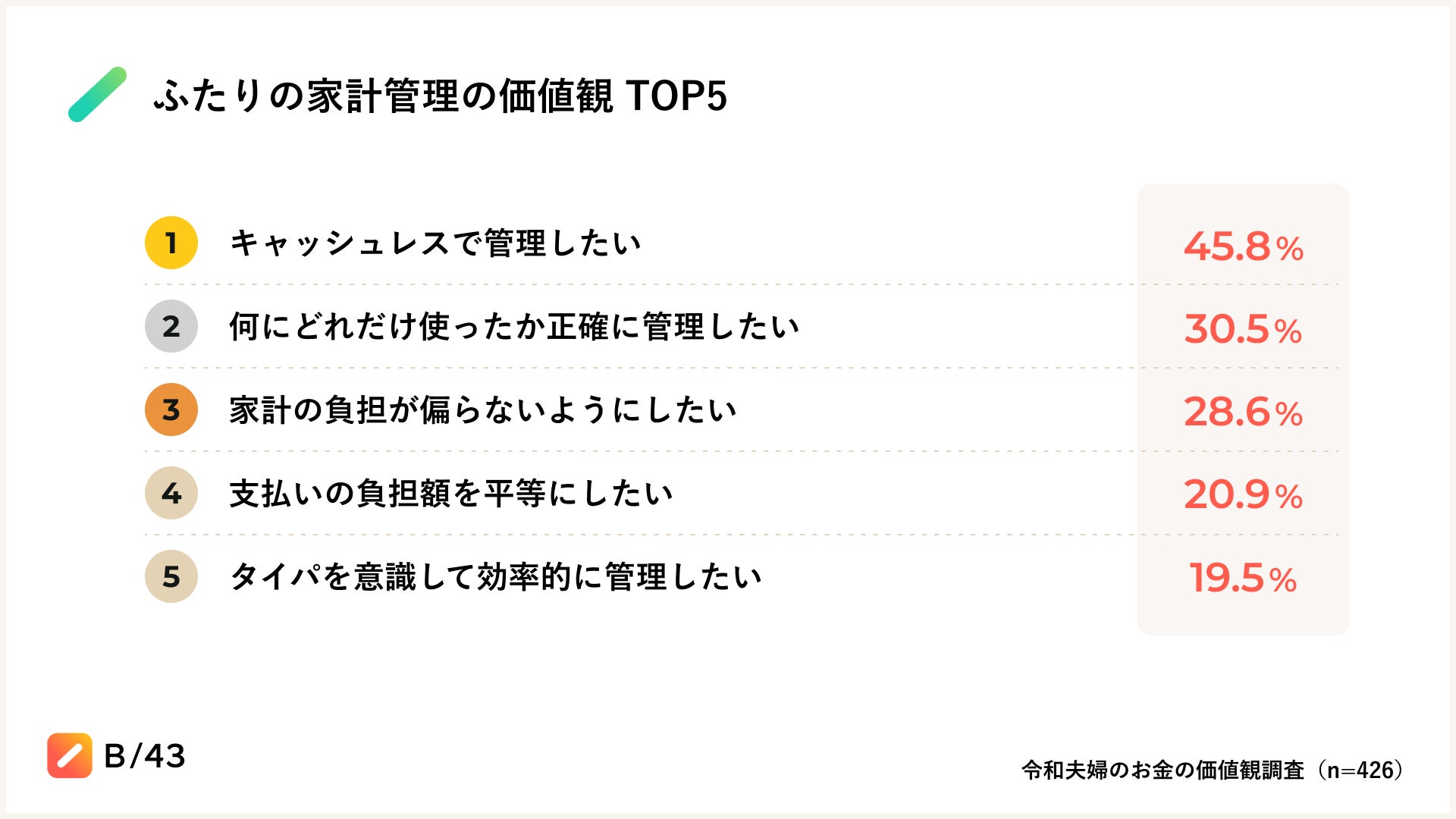 ふたりの家計管理に関する価値観について尋ねたところ、「現金よりもキャッシュレスで管理したい」(45.8%)、「何にどれくらい使ったか正確に管理したい」(30.5%)、「どちらかに管理の負担が偏らないようにしたい」(28.6%)が多く、何に使ったか正確に管理したいものの、キャッシュレスでお互いに負担少なくやりくりしたいという価値観が明らかになりました。
