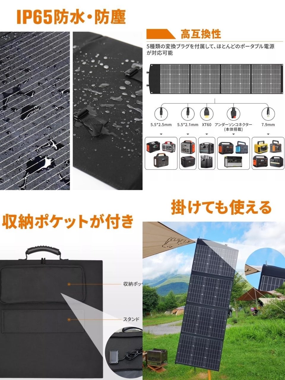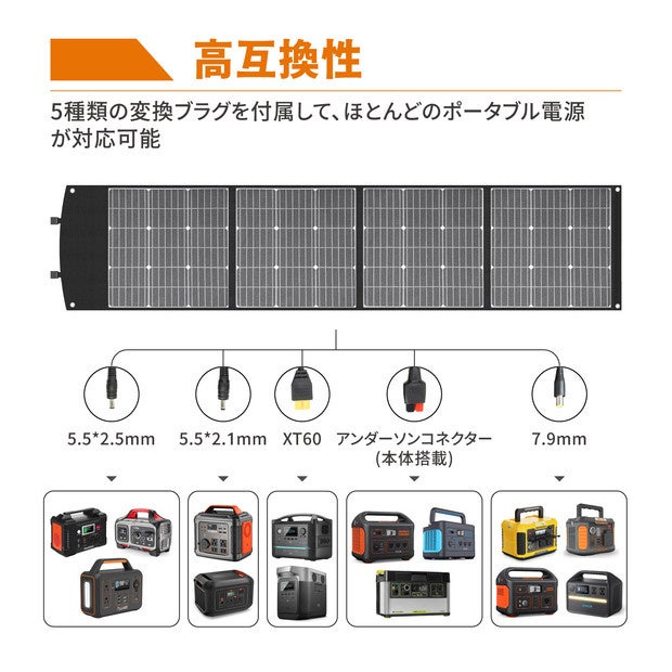 【高互換性】DC5521、DC5525、DC7909、XT60、アンダーソンなど5種類のコネクタ付きが同梱されます、BALDRのポータブル電源だけではなく、市販のほとんどのポータブル電源へ充電できます。