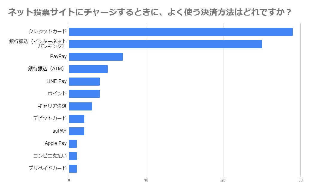 このアンケート結果から、ネット投票サイトにチャージする際に最もよく使われる決済方法はクレジットカードであり、回答者の 34.5%がこの方法を選んでいます。次に多いのは銀行振込(インターネットバンキング)で、 29.8%の回答者が利用しています。