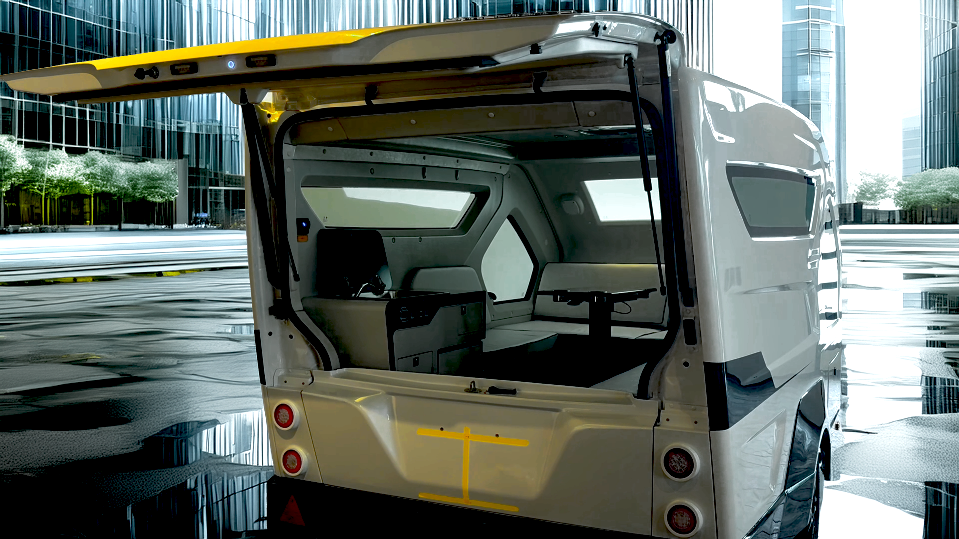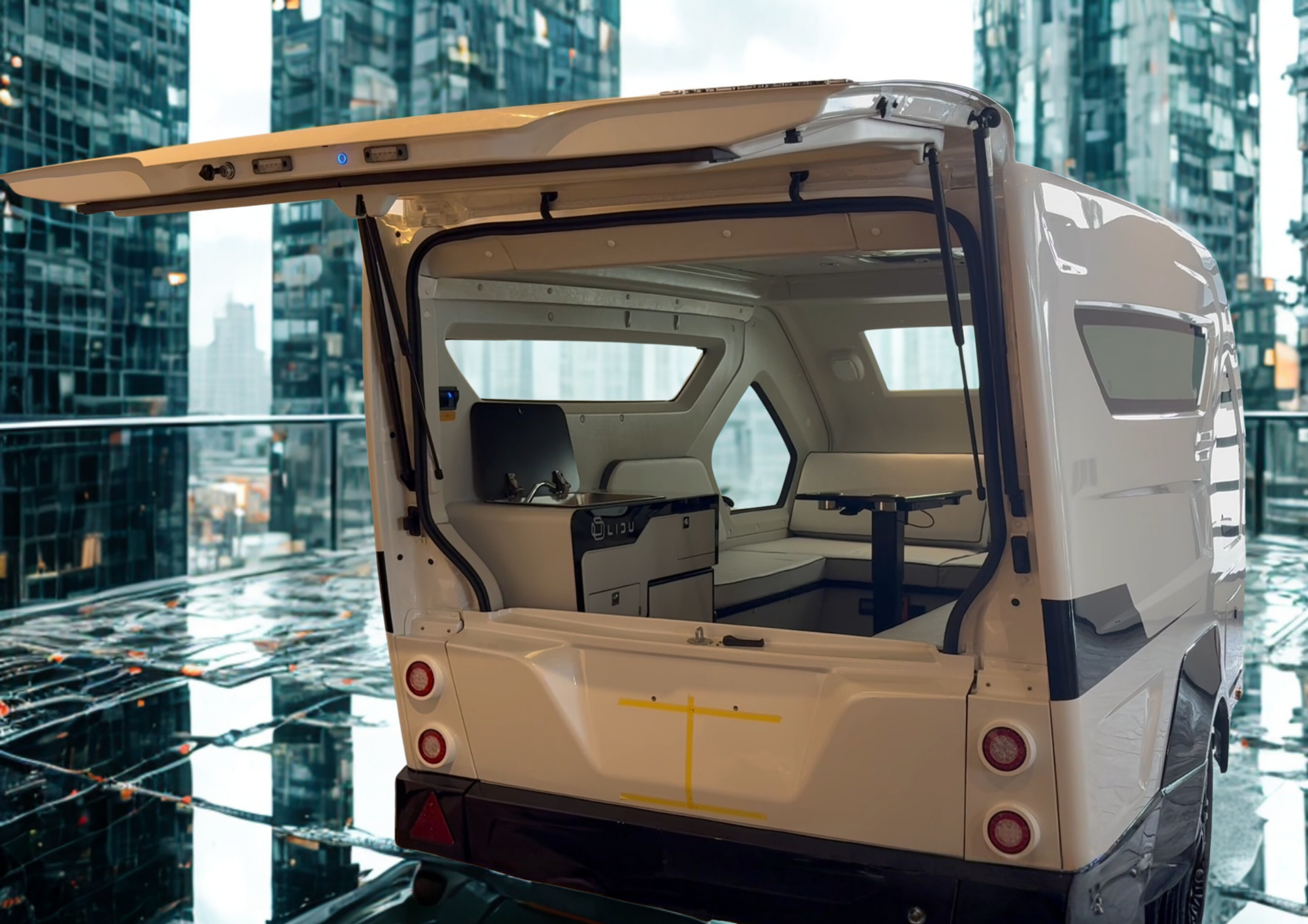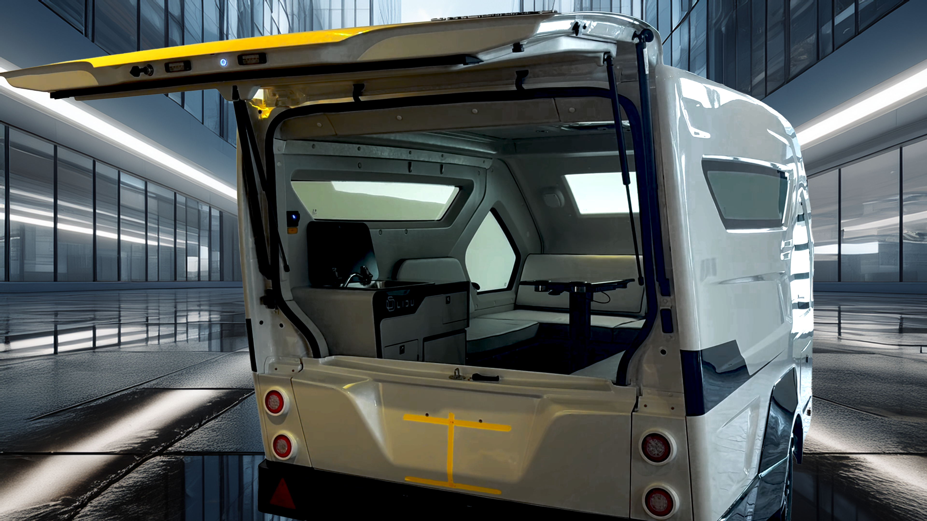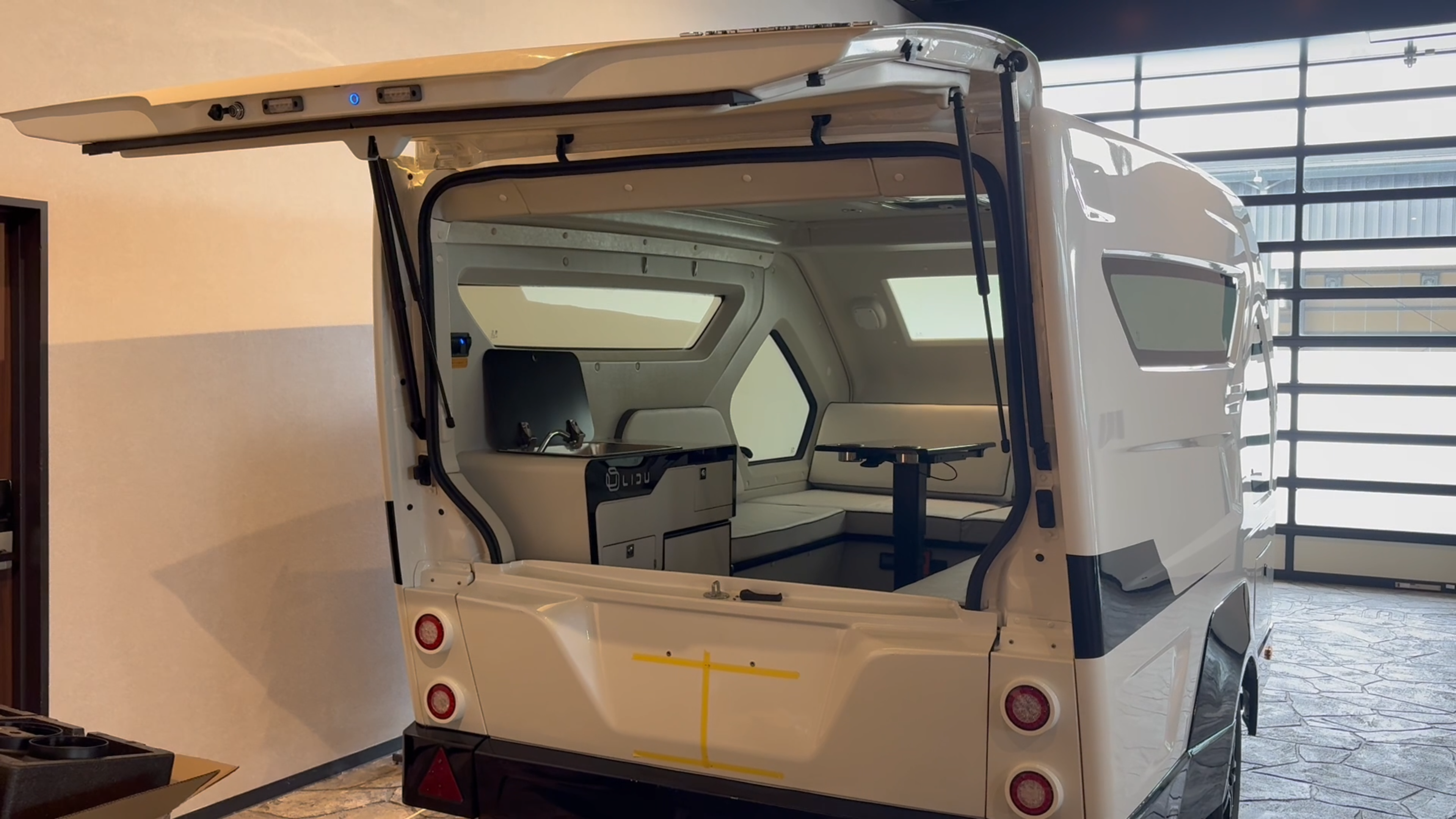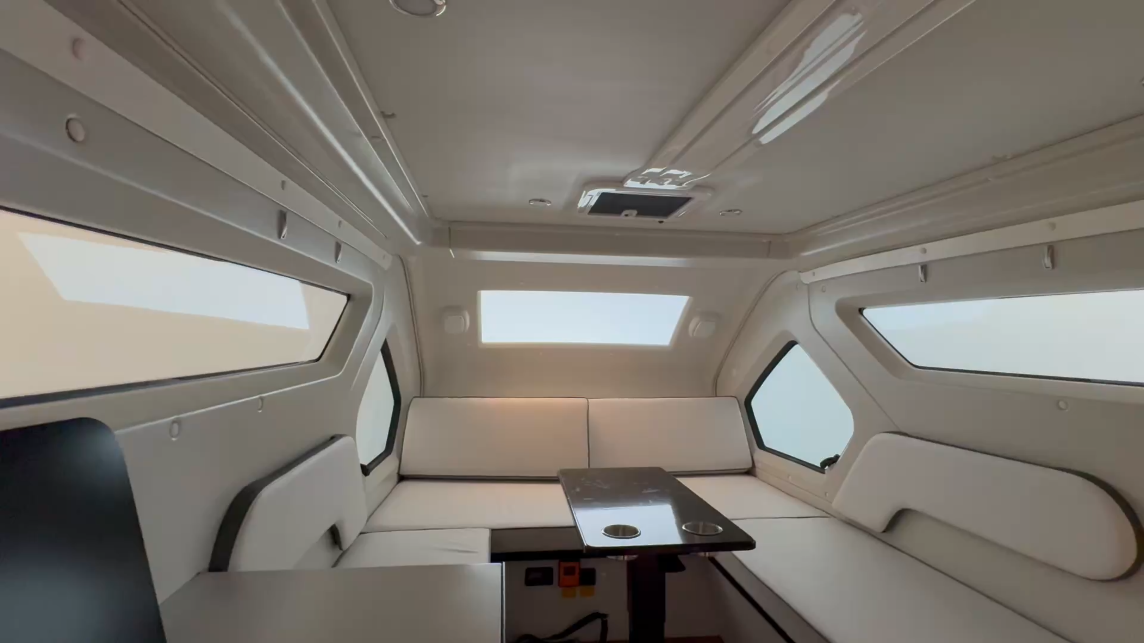 室内に足を踏み入れると、幾何学的な窓配置と間接照明が織りなす未来的な空間が広がります。コの字型のソファレイアウトは、昼はくつろぎの場として、夜はベッドスペースとして機能。中央にはカップホルダー付きのテーブルを配置し、食事や作業にも最適です。