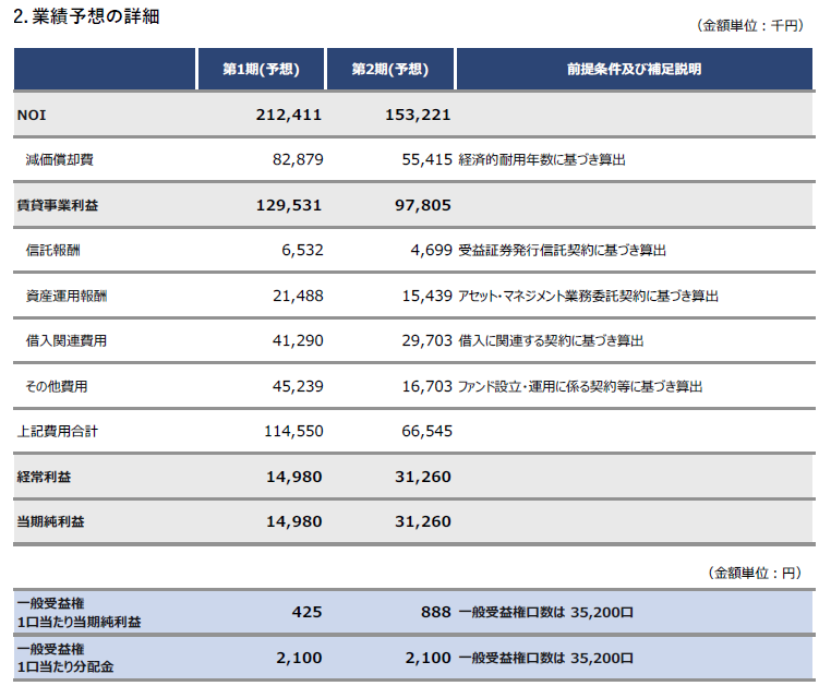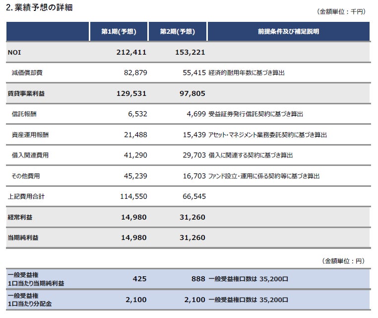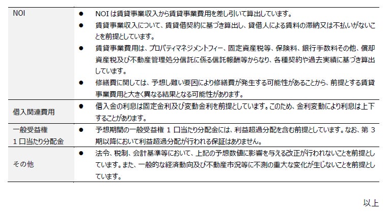ご注意:本資料に記載されている予想数値は、一定の前提条件のもとに算出した現時点の見込額であり、今後の賃借人の経営状況・財務状態の変動若しくは貸借人の異動等に伴う賃料収入の変動、予期せぬ修繕の発生等運用環境の変化、火災や災害等の発生による物件の状況への変化又は金利の変動等状況の変化により、前提条件との間に差異が生じ、その結果、収益及び分配金は大きく変動する可能性があるため、当該予想数値の実現や達成を保証するものではありません。また、本資料に記載されている予想期間及び以降の期間における分配金を保証するものではありません。