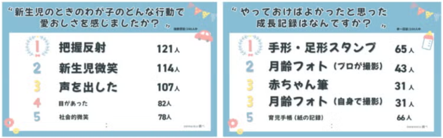 また、「新生児の時、わが子のどんな行動で愛おしさを感じましたか?」というアンケートでは、成長とともに消えてしまう把握反射などのスキンシップが一生の思い出になっていることがわかりました。