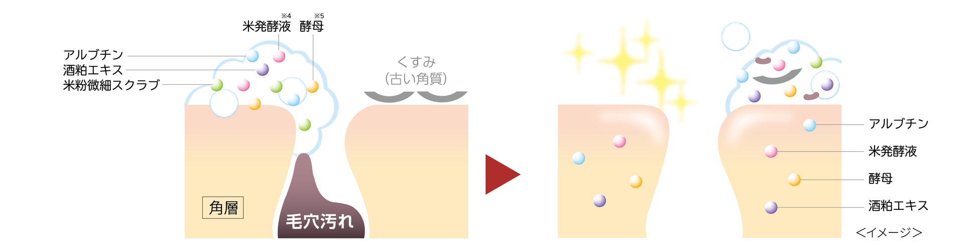 “酒粕を扱う杜氏(日本酒職人)の手は美しい”という言い伝えをヒントに、熊本県河津酒造の酒粕由来エキスを配合。キメの細かい濃密もち泡でくすみ※2と毛穴汚れを洗い流し、しっとり透明感のある肌に導きます。
