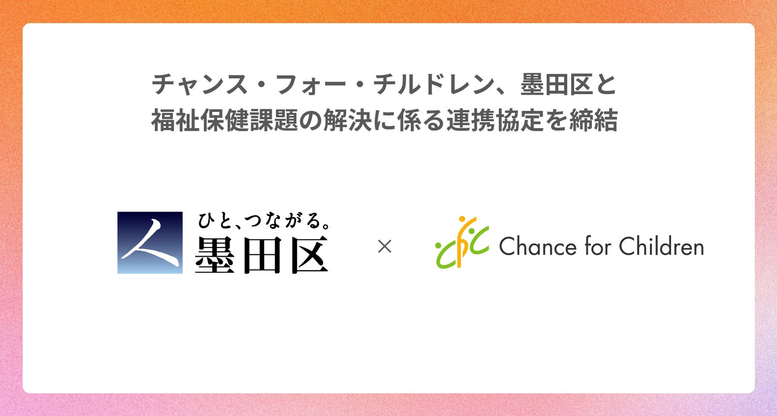 子どもの体験格差の解消に取り組む公益社団法人チャンス・フォー・チルドレン(東京都墨田区、代表者:今井悠介・奥野慧、以下CFC)は、この度、東京都墨田区(区長:山本亨、以下墨田区)との間で、デジタル技術を活用した福祉保健課題の解決に係る連携協定(以下本協定)を締結したことをお知らせいたします。