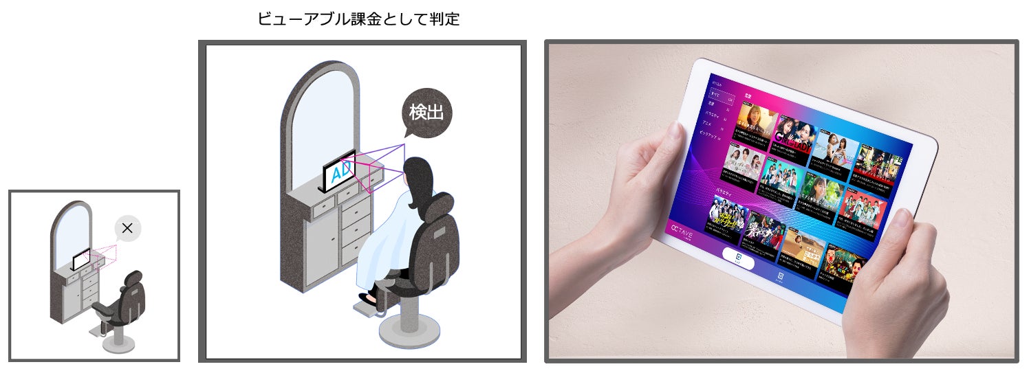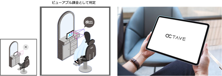 また、ビューアブルインプレッション課金を採用することで、タブレット端末の正面に人が着座している場合に、カメラによって顔を判定(※4)することで有効再生(課金imp対象)と判定し、効率的な配信が実現できます。