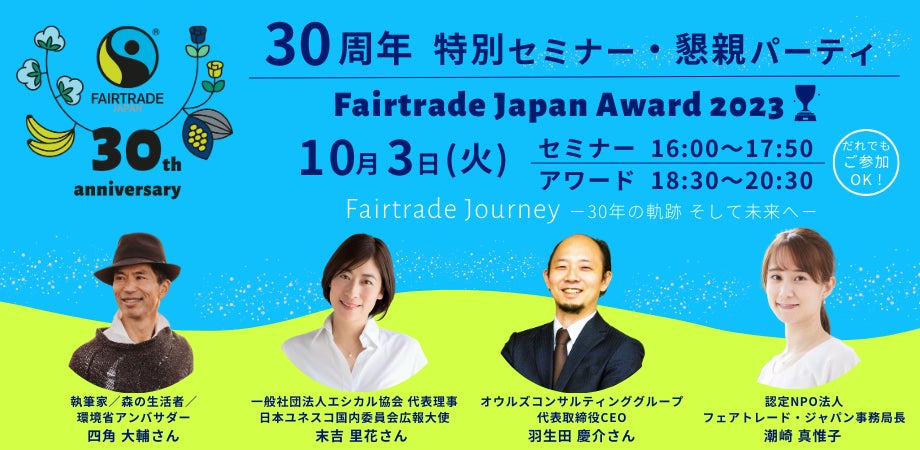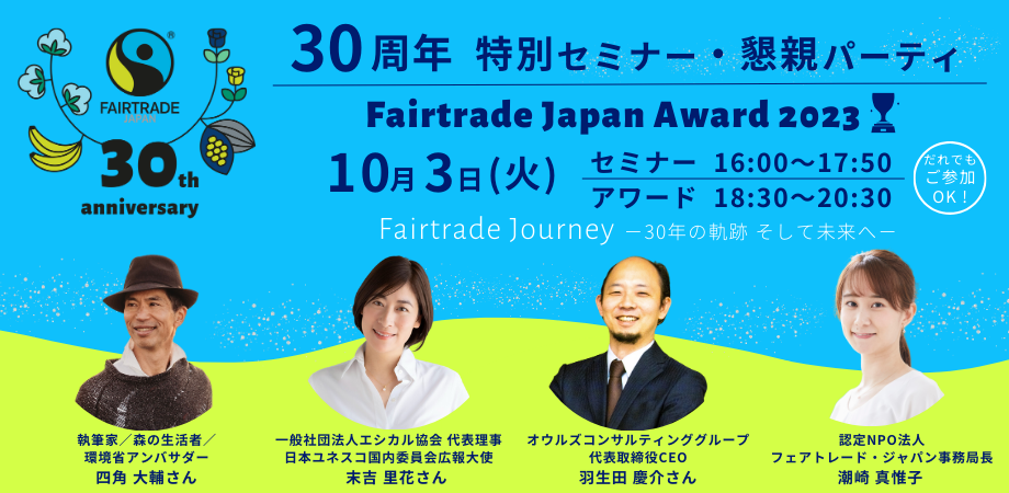 フェアトレード・ジャパン30周年特別イベント「環境・人権問題で大きく動く世界の最新動向、消費者とフェアトレードの未来」四角大輔さん、末吉里花さん、羽生田慶介さん等によるセミナー10月3日(火)開催