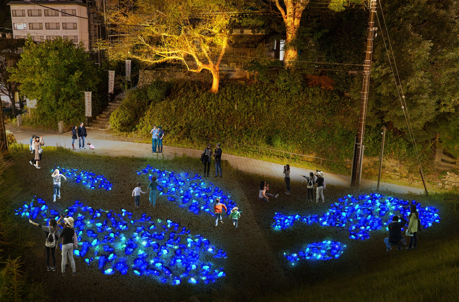 湯本エリアの皆さんを中心に、これまでのワークショップで製作した大型のあかりモチーフを、音信川沿いに設置。ゆるやかに明滅するあかりが音信川の水面に浮かび上がり、幻想的な風景を作りだします。