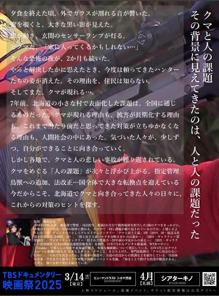 4月5日から札幌・シアターキノで開催される「TBSドキュメンタリー映画祭2025」。HBC制作の『劇場版 クマと民主主義』の上映日時が決定しました。2018年からニュースで伝え続け、2019年・20年・24年にテレビドキュメンタリーとして放送したものに新たな要素を加え、ドキュメンタリー映画化した作品です。