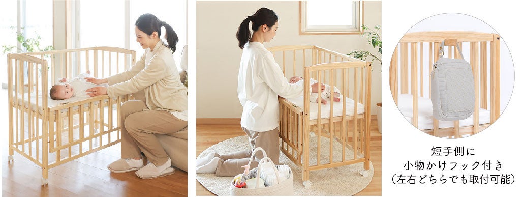 赤ちゃんをいつもそばに寝かせることができ、安心して子育てできるベビーベッドです。