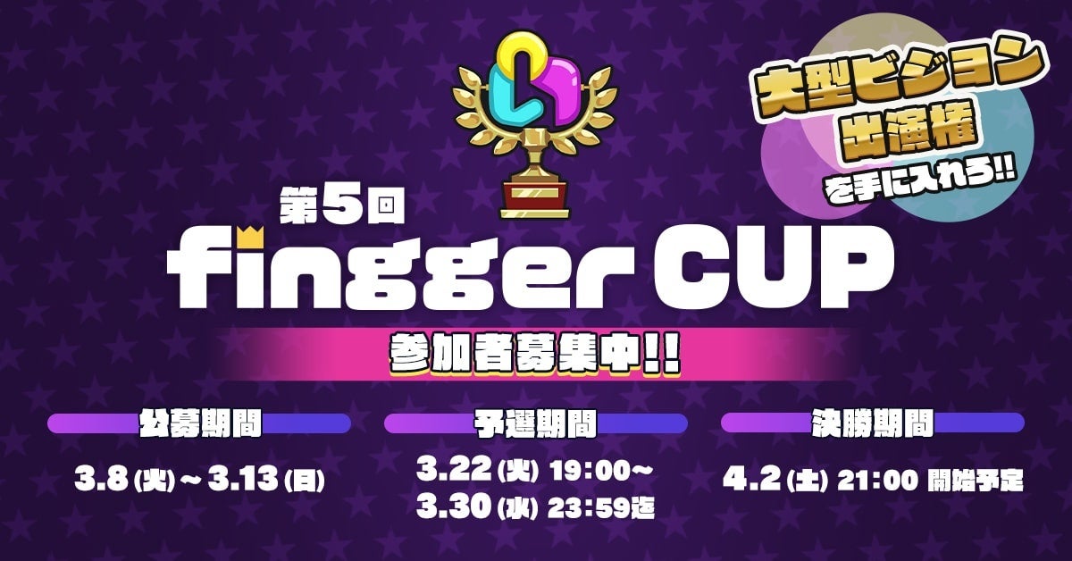 上記に伴い、3月8日(火)より各配信者様による、本プロモーション映像への出演権を賭けた「第5回 fingger CUP」の開催をお知らせいたします。
