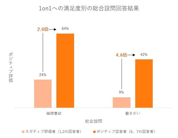これは1on1の内容に満足していると「仕事の継続意欲」も「働きがい」も、満足していないときの2倍感じやすいということを表しています。