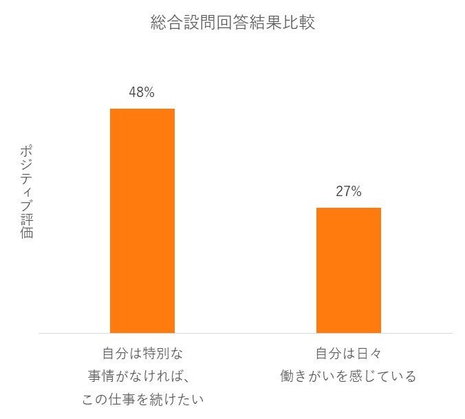 反対に「働きがい」など、熱意をもって真剣に働けているかどうか?という趣旨の設問へのポジティブ評価は低い結果でした。