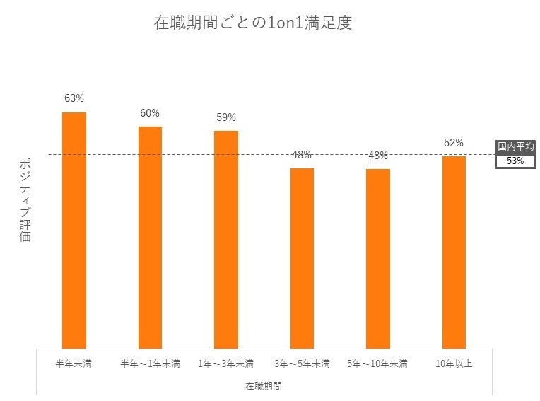 昨年同様、国内全体として「働く期間(在職期間)が長くなるほど、“すべての”スコアが下がる」傾向が全体的にありました。今回は、Well-being診断とは別で調査した1on1ミーティング(以下1on1)を例にこの国内の課題について紹介いたします。