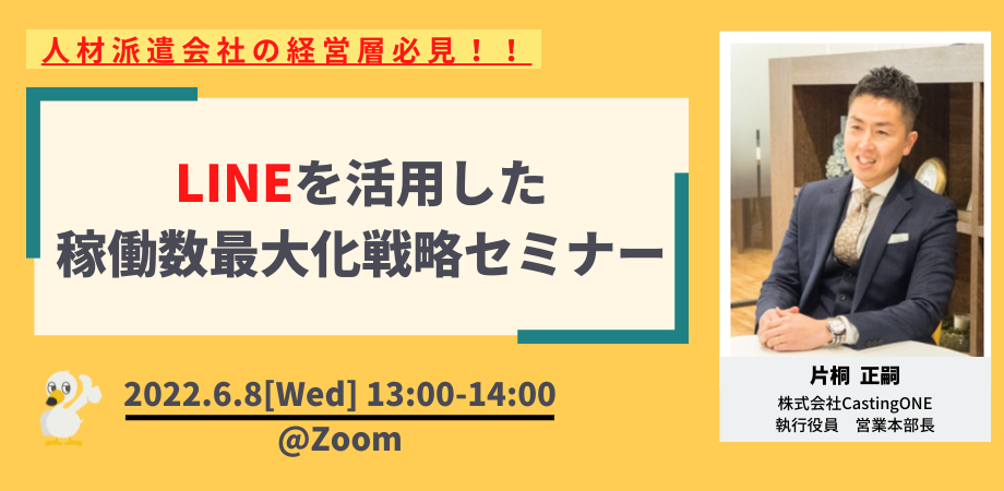 株式会社CastingONE(キャスティングワン、本社:東京都渋谷区、代表取締役:野澤 怜司)は、「業界初!LINEを活用した稼働数最大化戦略セミナー」をテーマに無料セミナー(ウェビナー)を開催します。
