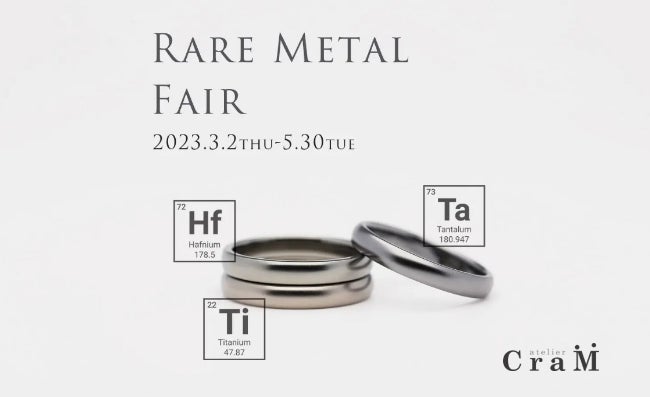 株式会社三雄工芸 (新潟県見附市、代表取締役:平沢竜人)が運営する 、オーダーメイド工房アトリエクラム[Atelier CraM(アトリエクラム)https://www.handmade-jewelry.jp/]は、2023年3月2日(木曜)から、レアメタルフェアを開催いたします。