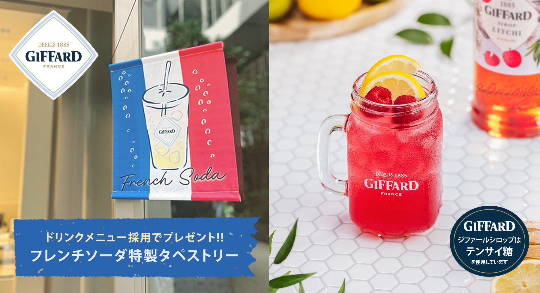 ジファールシロップを使用してフレンチソーダを展開される飲食店様向けに、特製タペストリーをプレゼント。目を惹くトリコロールカラーと夏らしい雰囲気で集客にご活用いただけます。