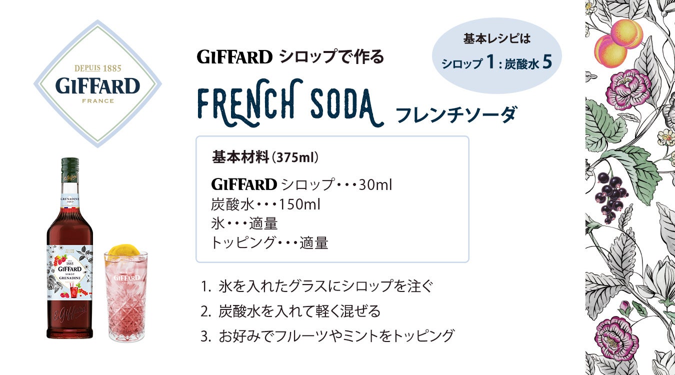 猛暑で、爽快なドリンクを求めるニーズに応じ炭酸市場が活況する中、仏リキュール&シロップブランドの「ジファール」が甘すぎない炭酸飲料企画「フレンチソーダ」を展開中。メニュー採用でタペストリープレゼント!